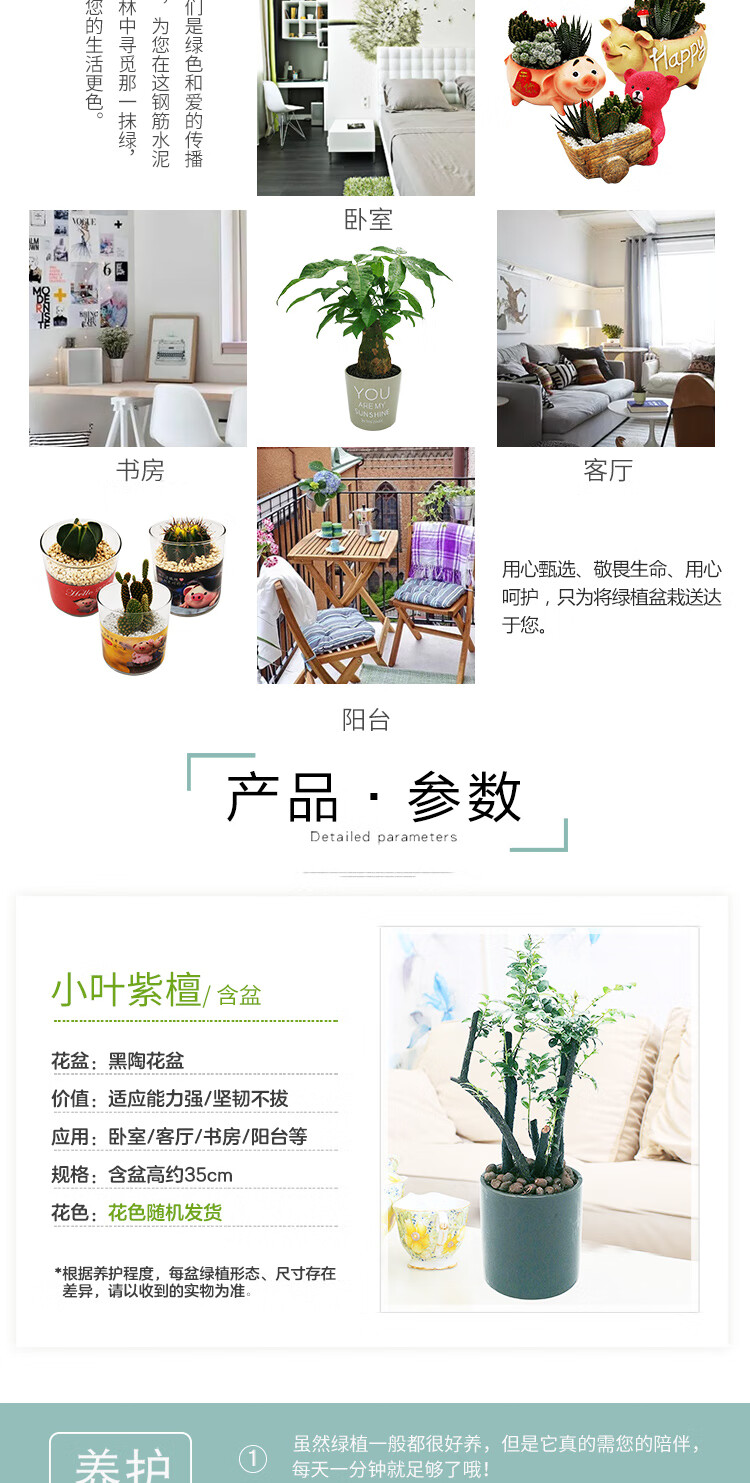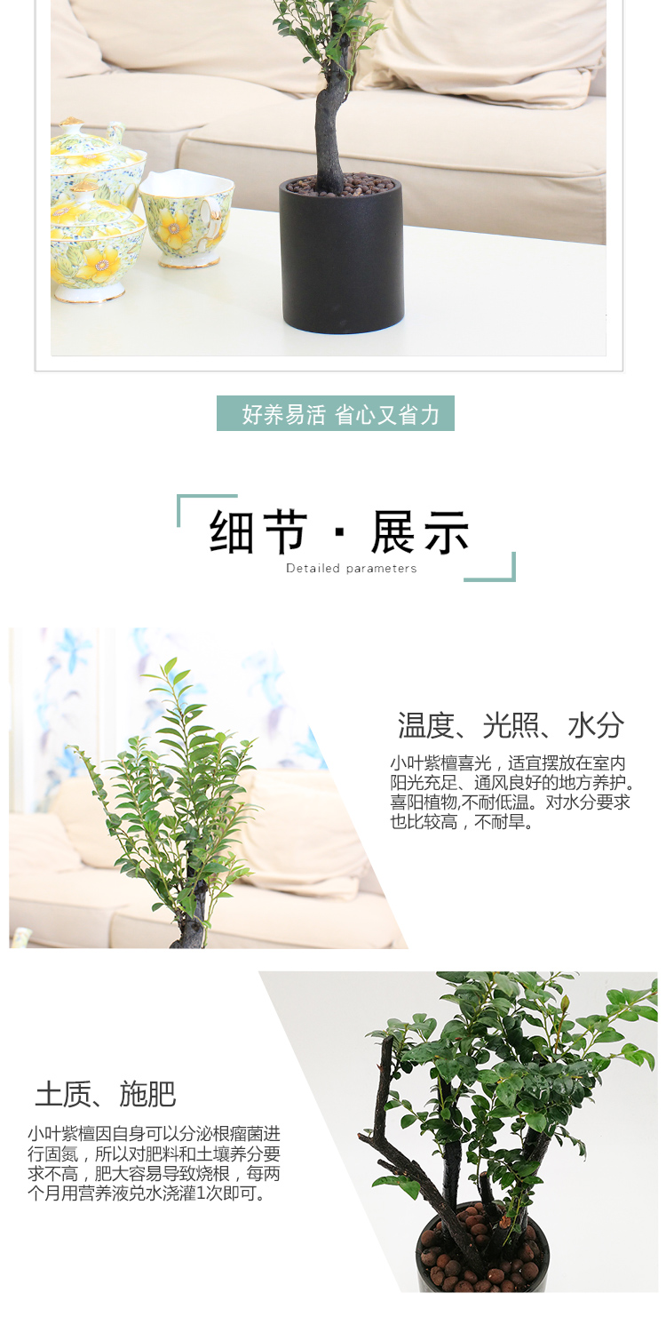 是否含花盆:带盆栽好;适用空间:庭院,阳台,客厅,办公桌,卧室,书房;植物品种:小叶紫檀;植物类别:观叶植物;包装清单:小叶紫檀×1、黑陶花盆×1、包装箱×1;