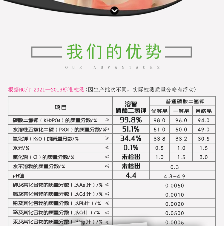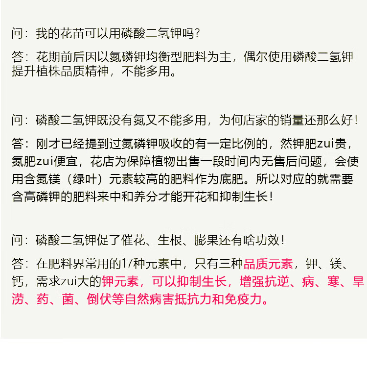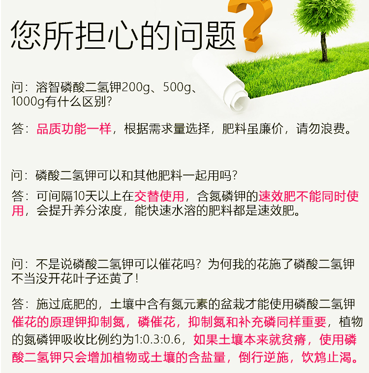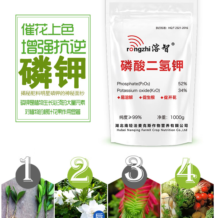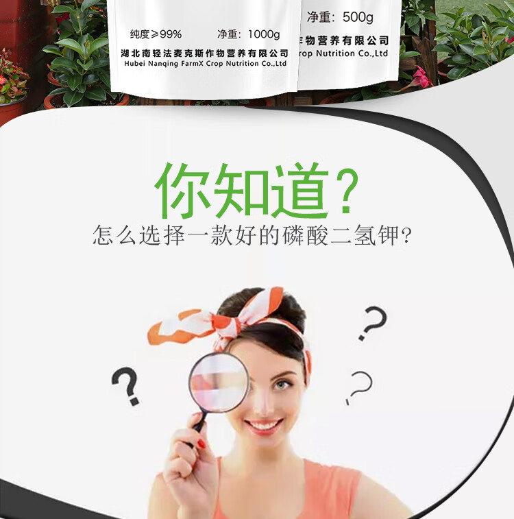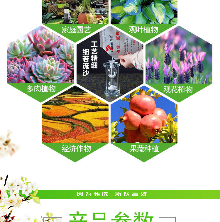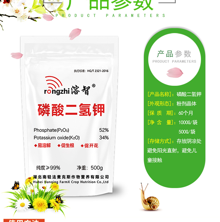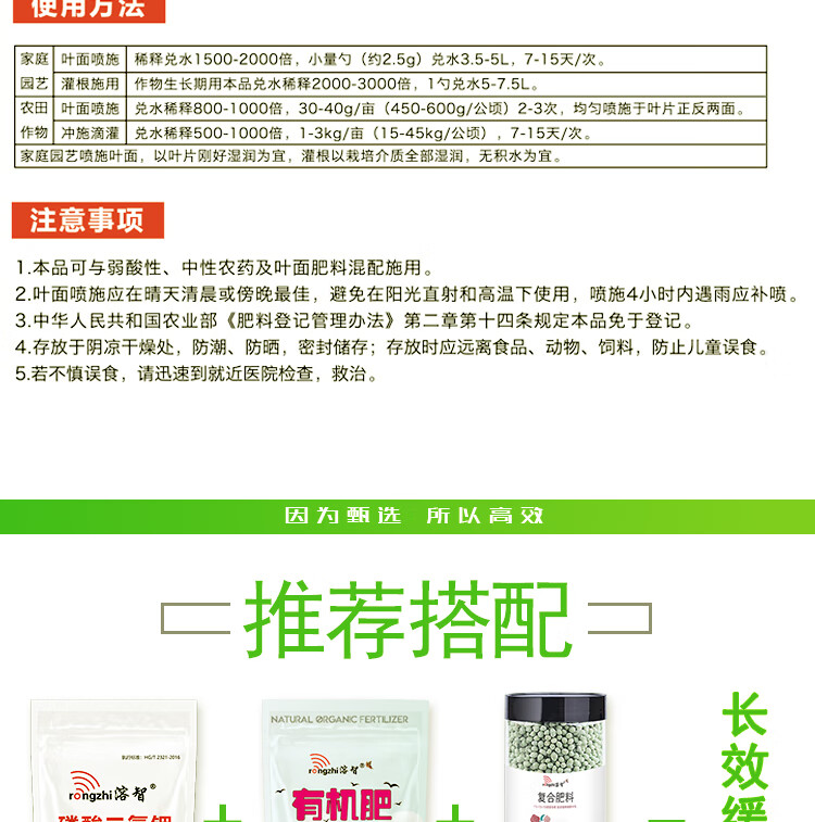 适用作物:果树,粮食作物,经济作物,园林绿化,家庭园艺,蔬菜;施用方法:叶面喷施,冲施,滴灌,追施;包装清单:规格:1kg/袋;