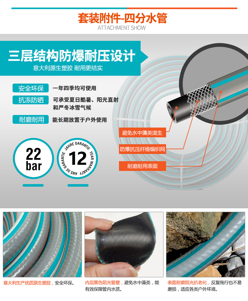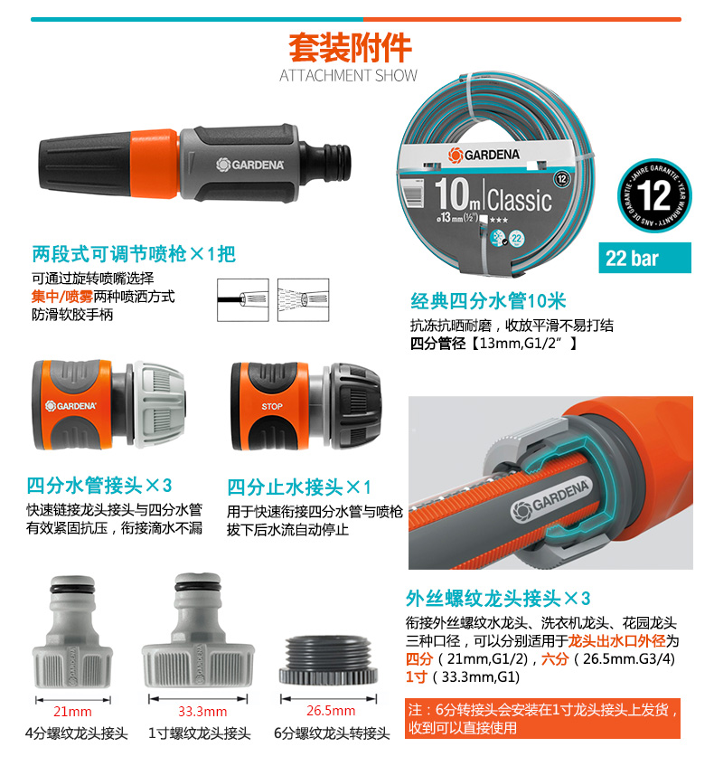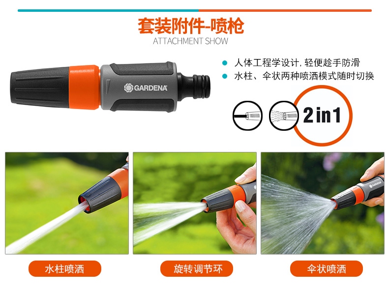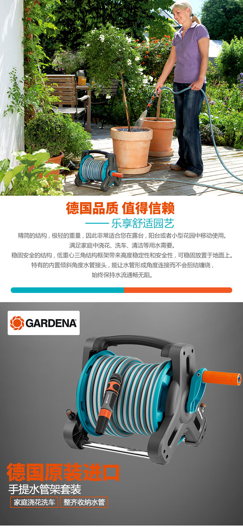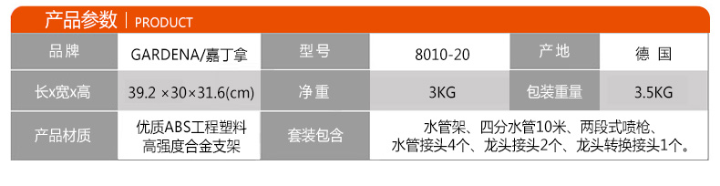 材质:其它;国产/进口:进口;分类:水枪/水管/水管车;品牌:嘉丁拿(GARDENA);包装清单:水管架*1,四分水管10米*1,两段式喷枪*1,水管接头*4,龙头接头*2,龙头转换接头*1;