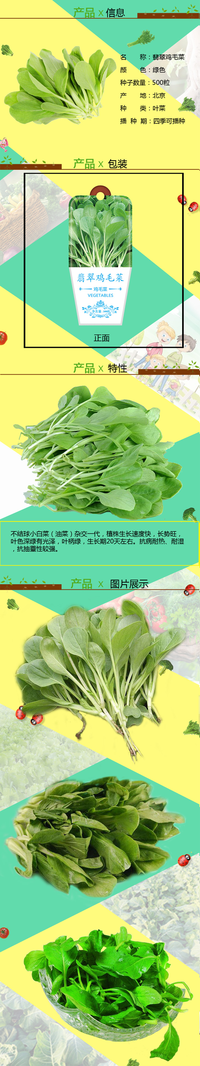种类:叶菜类;适种区域:东北,华北,华中,华东,华南,西南,西北;适播季节:春,夏,秋,冬;国别:国产;类别:常规种子;种子经营许可证编号:CD(京)农种经许字第(2014)第0025号;检疫证明编号:1101080020130040;纯度(%):≥96.0;净度(%):≥98.0;芽率(%):≥85;水分(%):≤7.0;包衣:否;生产年份:2017;包装清单:一袋种子x1;