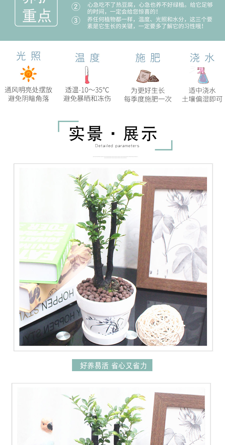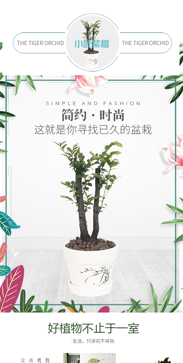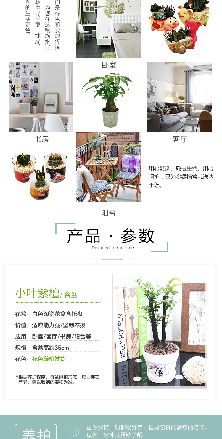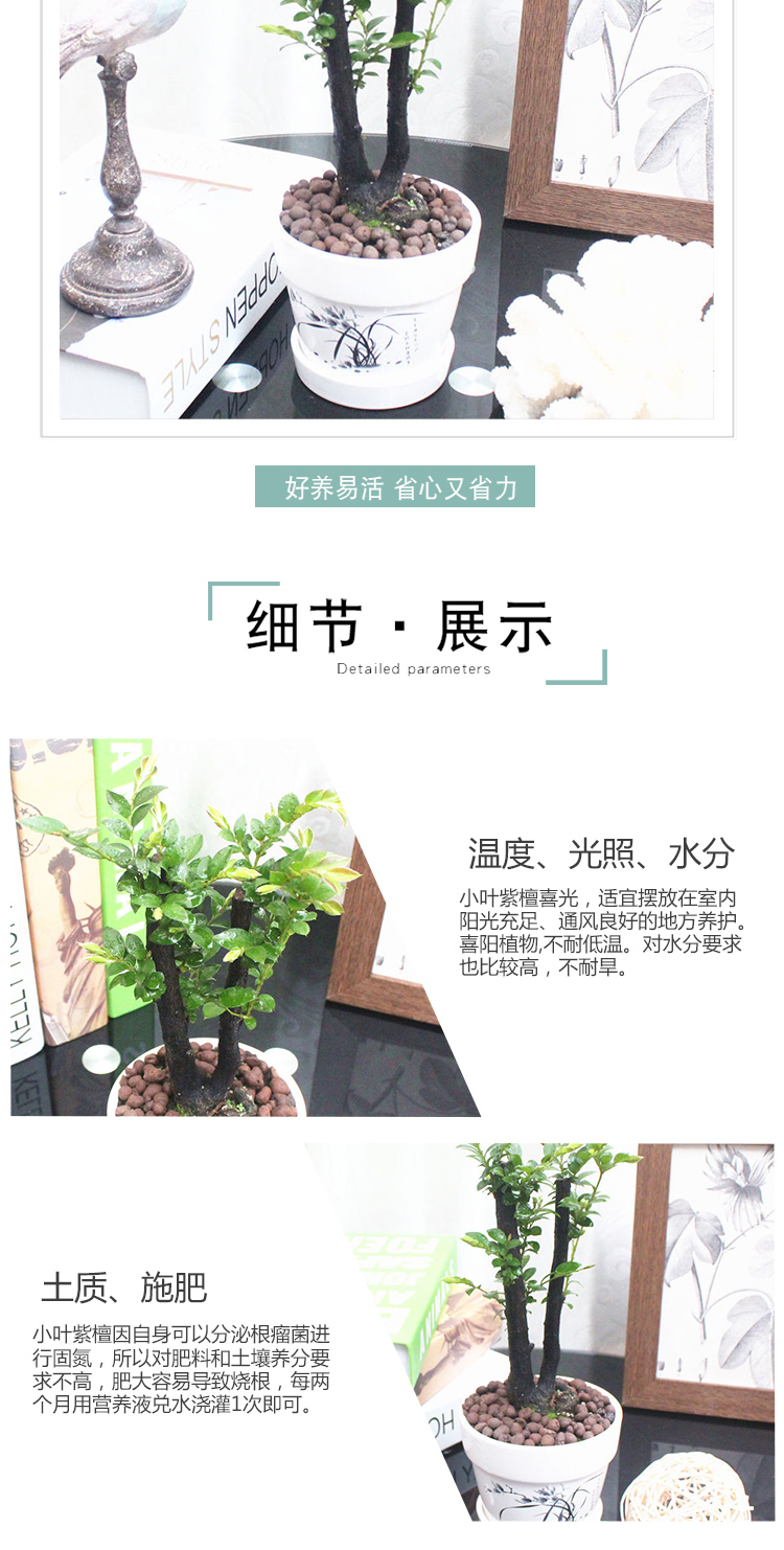 是否含花盆:带盆栽好;适用空间:庭院,阳台,客厅,办公桌,卧室,书房;植物品种:小叶紫檀;植物类别:观叶植物;包装清单:小叶紫檀×1、白色印花陶瓷花盆×1、包装箱×1;