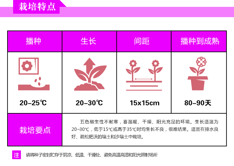 种类:草花;适种区域:东北,华北,华中,华东,华南,西南,西北;适播季节:春,夏,秋,冬;国别:国产;类别:常规种子;种子经营许可证编号:CD(京)农种经许字第(2014)第0025号;纯度(%):≥95.0;净度(%):≥98.0;芽率(%):≥80;水分(%):≤8.0;包衣:否;生产年份:2018;包装清单:一袋种子X1;