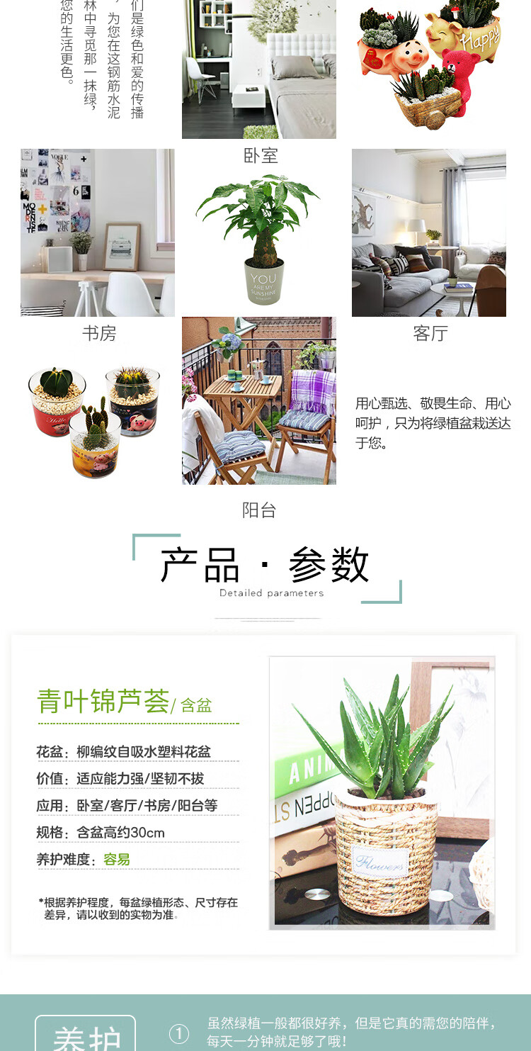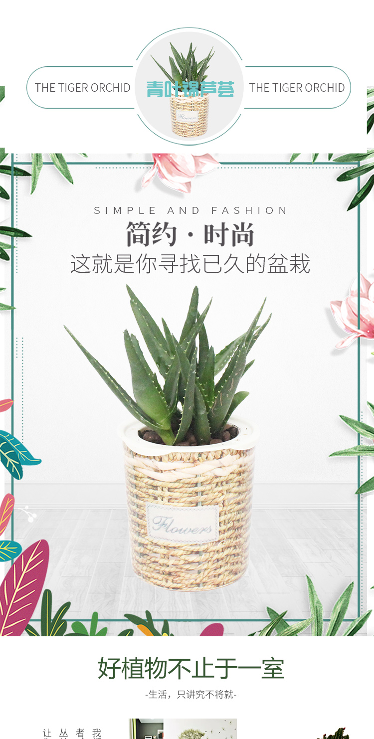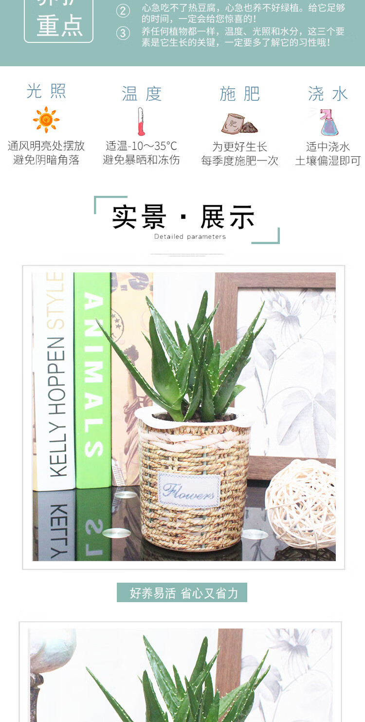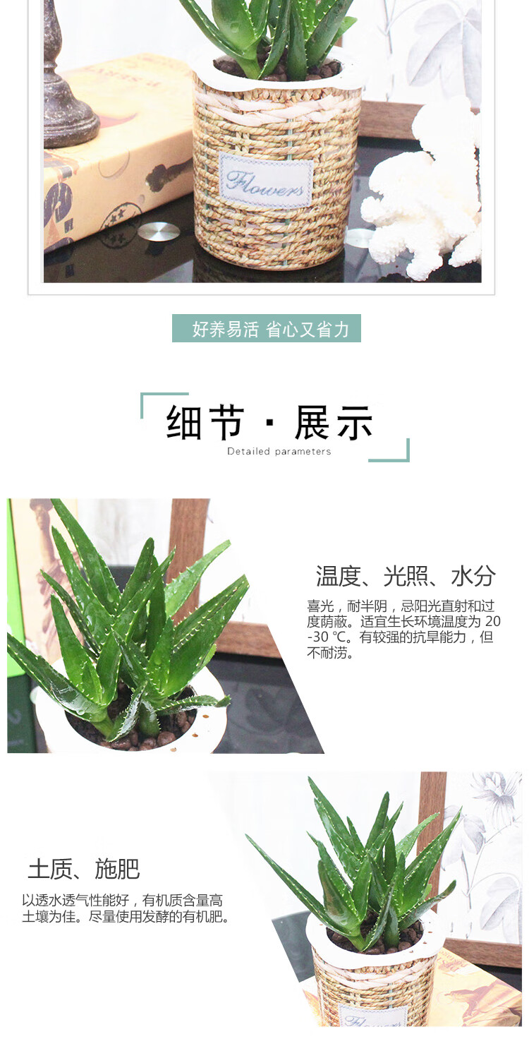 是否含花盆:带盆栽好;适用空间:庭院,阳台,客厅,办公桌,卧室,书房;植物品种:芦荟;植物类别:观叶植物;包装清单:青叶锦芦荟×1、柳编纹自吸水塑料花盆×1、包装箱×1;