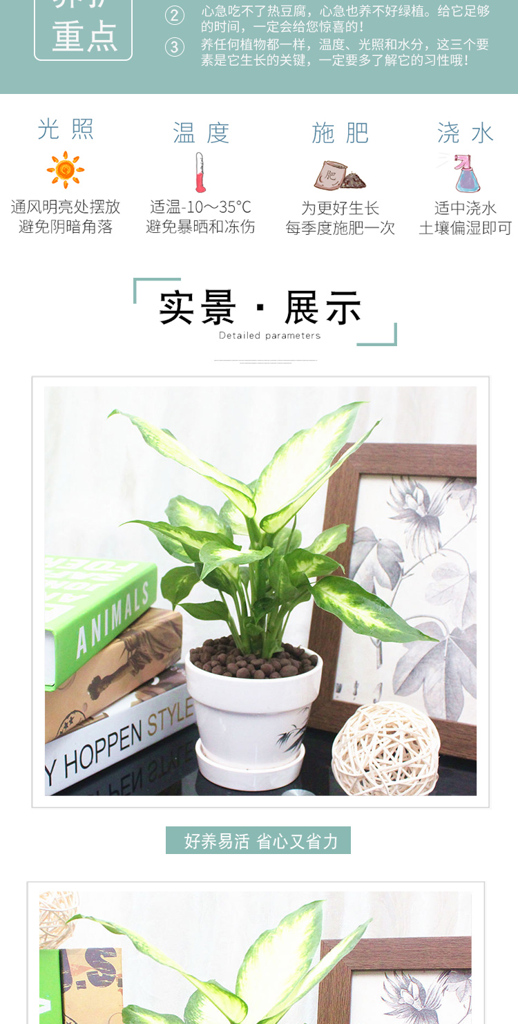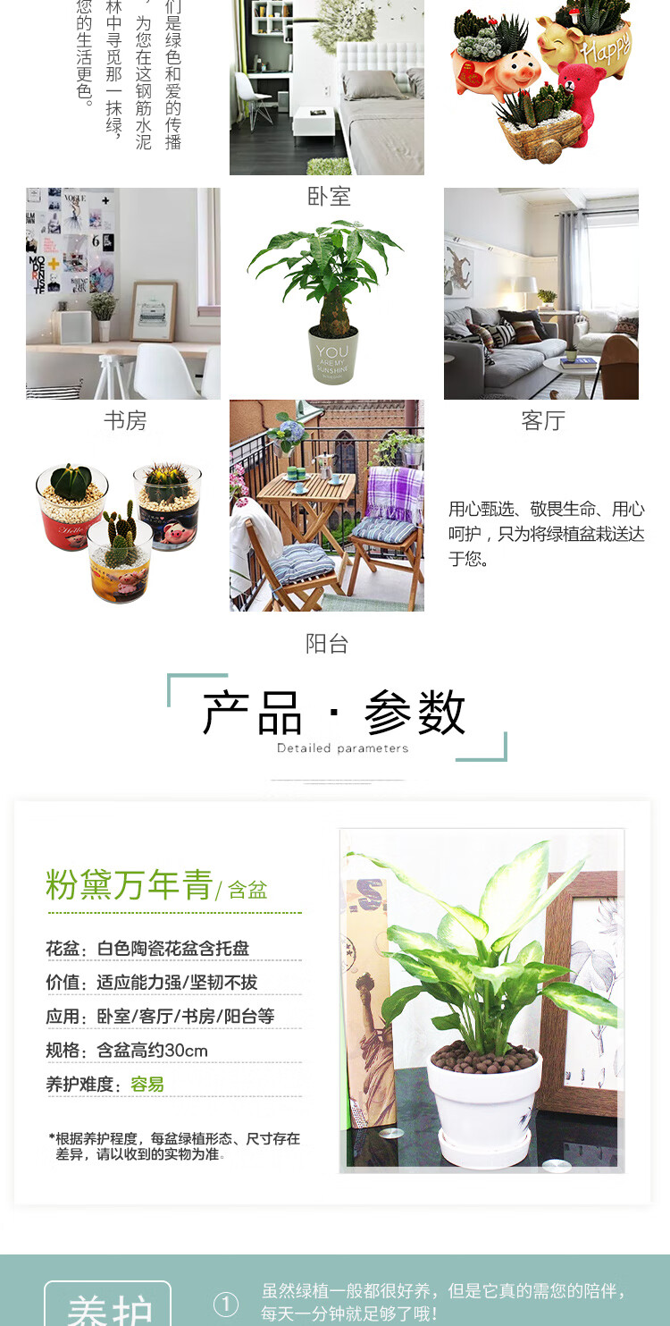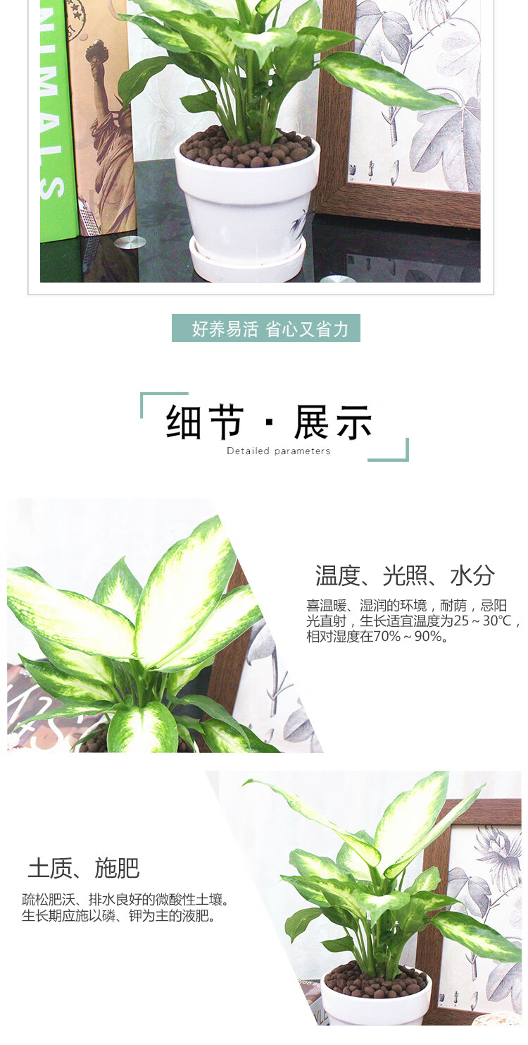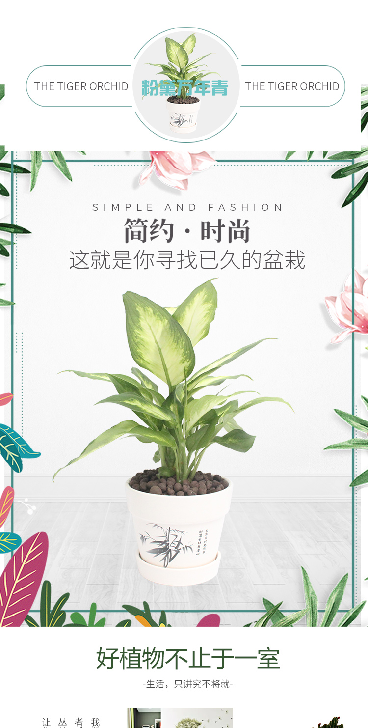 是否含花盆:带盆栽好;适用空间:庭院,阳台,客厅,办公桌,卧室,书房;植物品种:万年青;植物类别:观叶植物;包装清单:粉黛万年青×1、白色印花陶瓷花盆×1、包装箱×1;