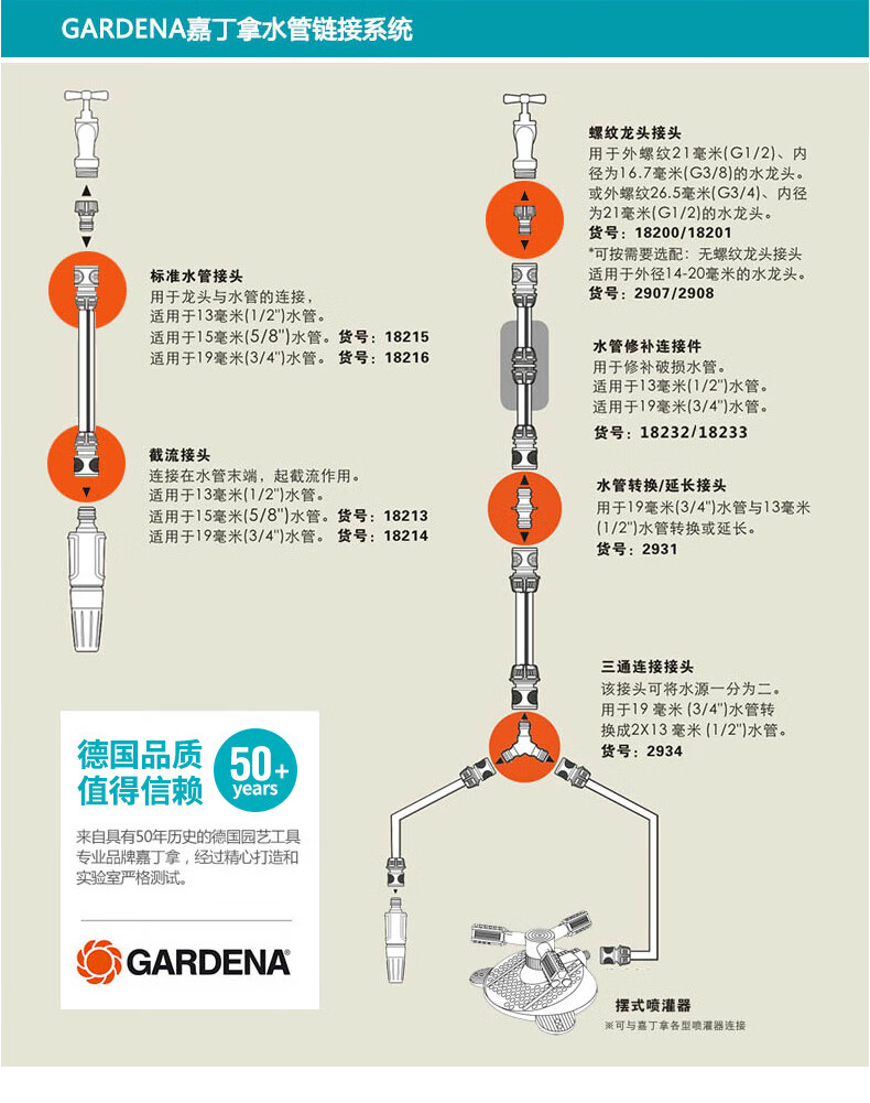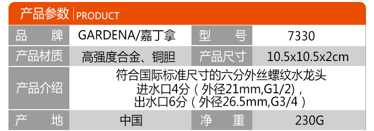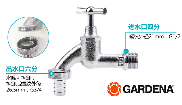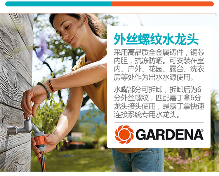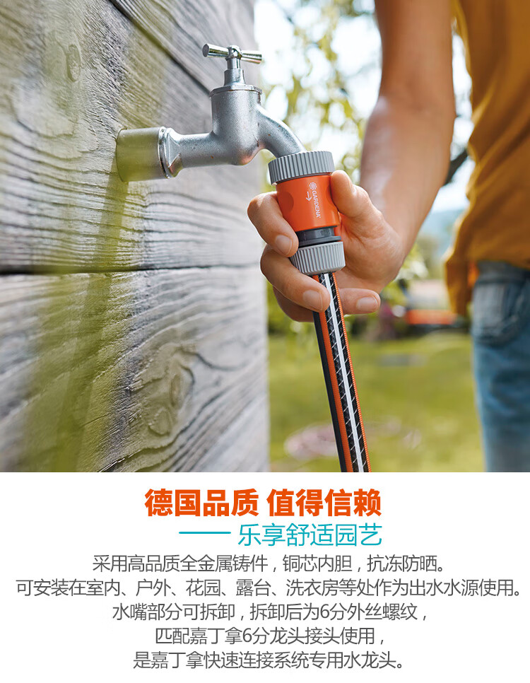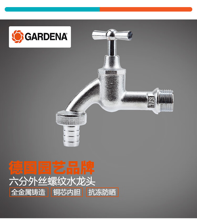 国产/进口:国产;分类:水龙头;品牌:嘉丁拿(GARDENA);包装清单:嘉丁拿6分水龙头*1;