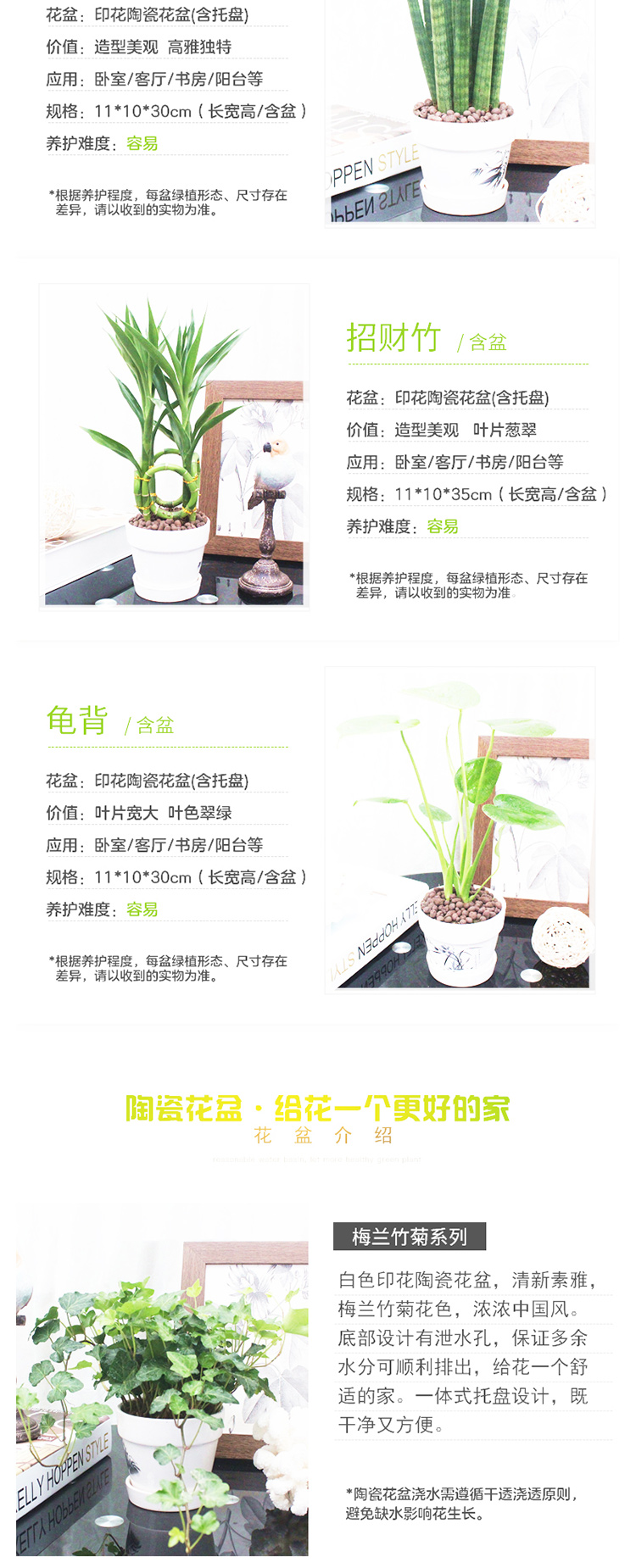 是否含花盆:带盆栽好;适用空间:庭院,阳台,客厅,办公桌,卧室,书房;包装清单:龟背×1、白色印花陶瓷花盆×1、包装箱×1;