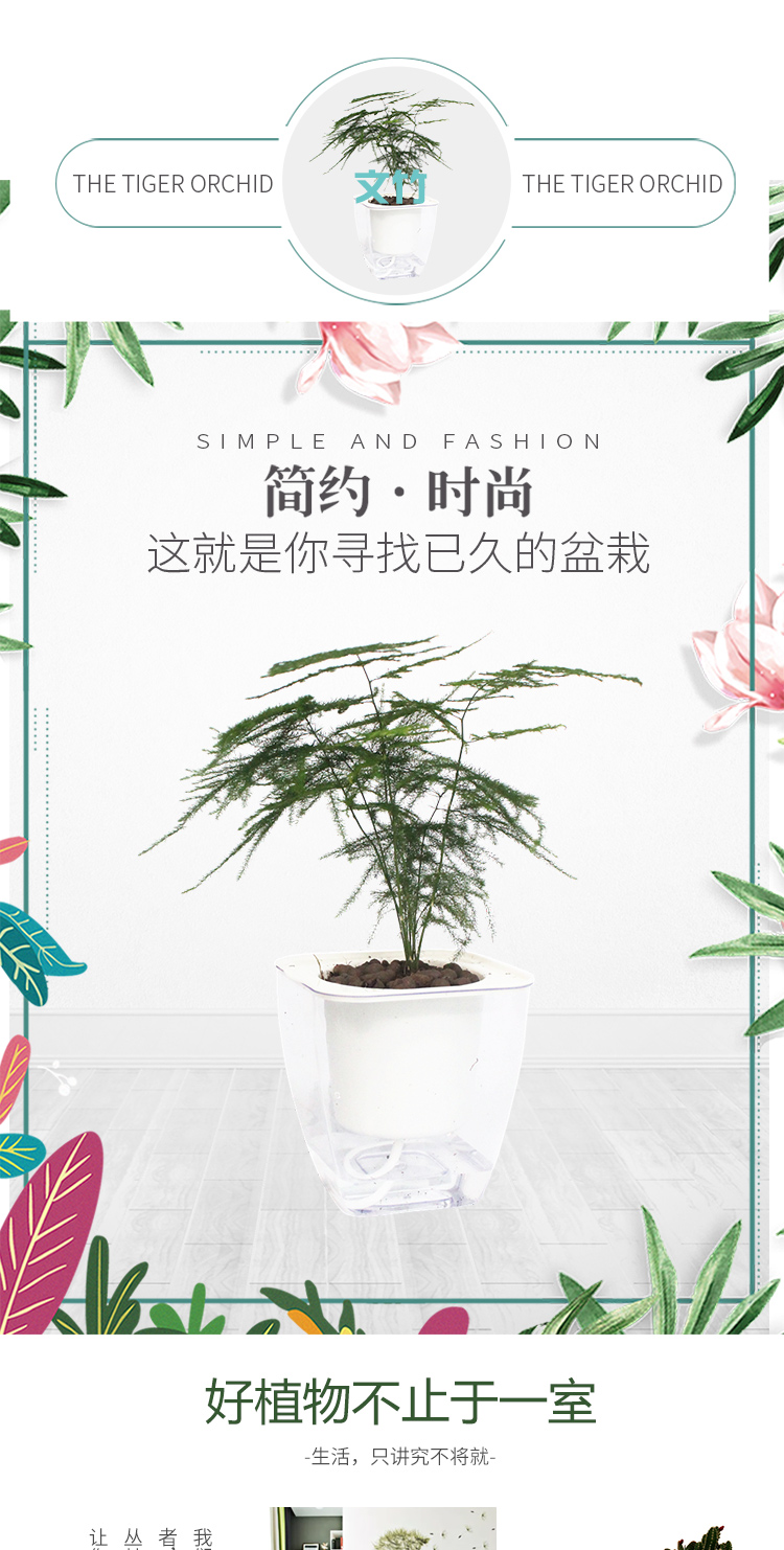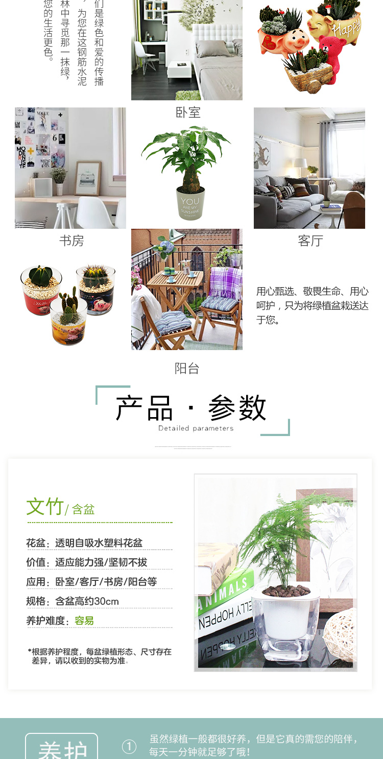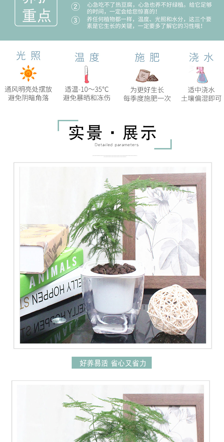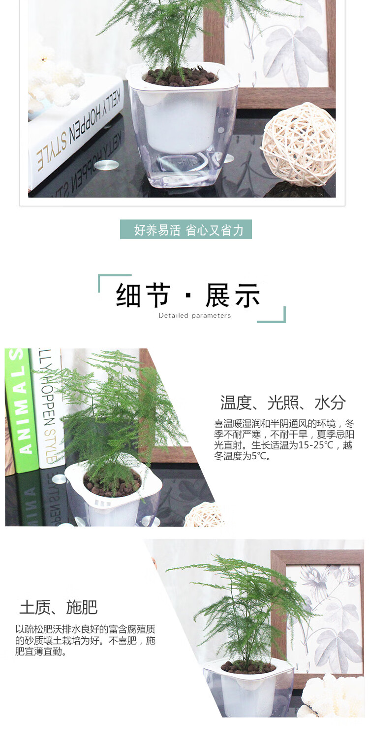 是否含花盆:带盆栽好;适用空间:庭院,阳台,客厅,办公桌,卧室,书房;植物品种:文竹;植物类别:观叶植物;包装清单:文竹×1、透明自吸水塑料花盆×1、包装箱×1;