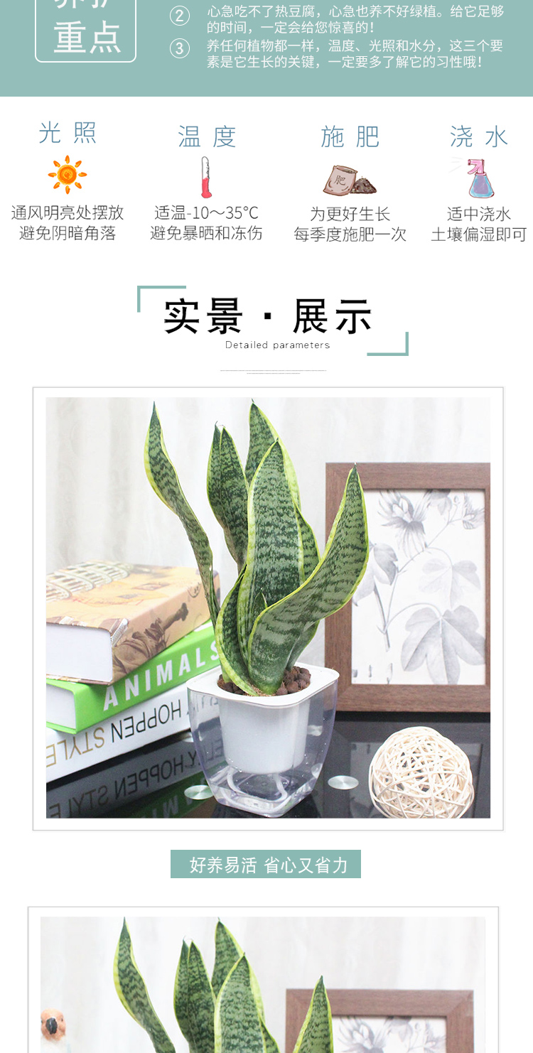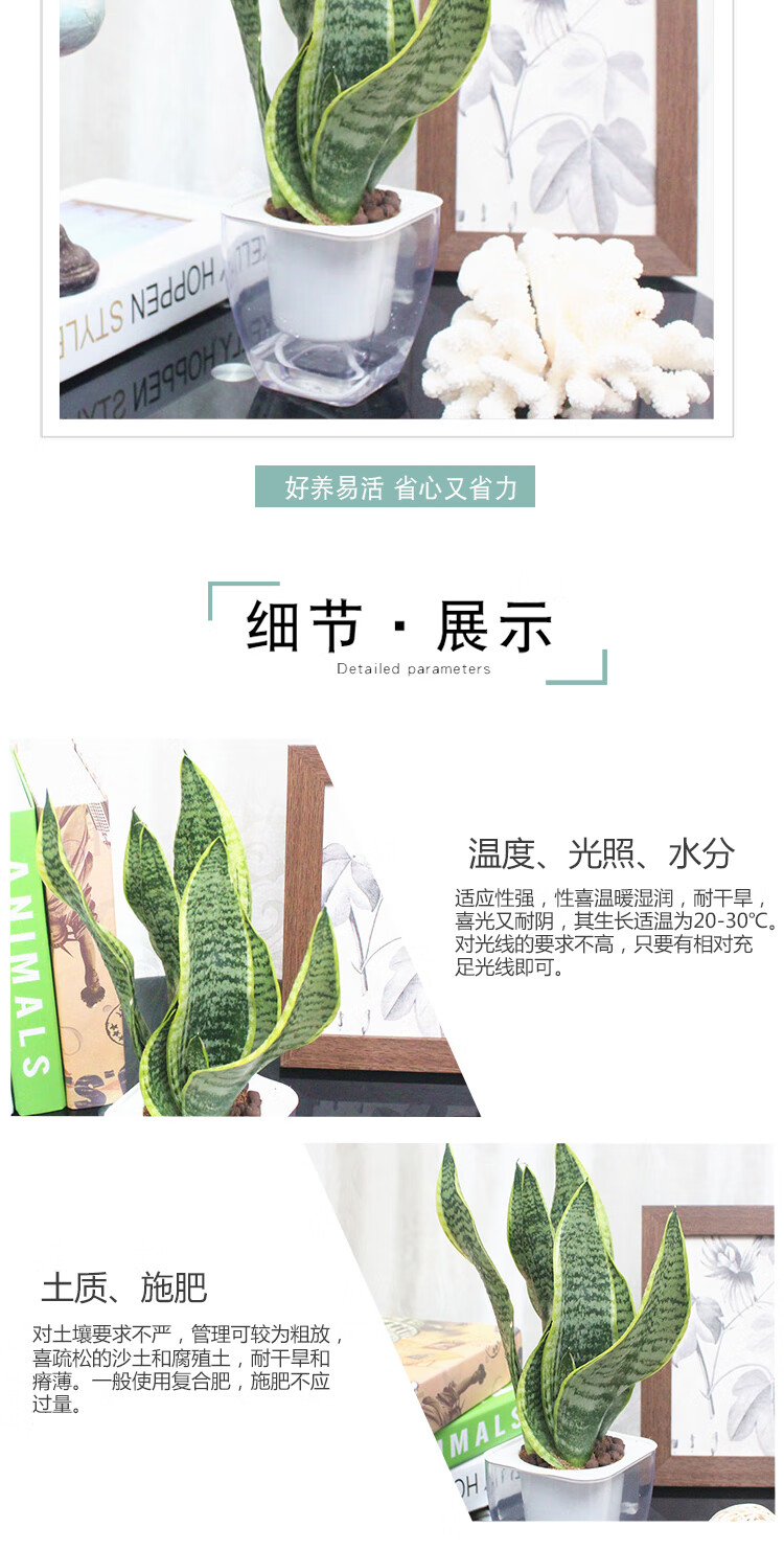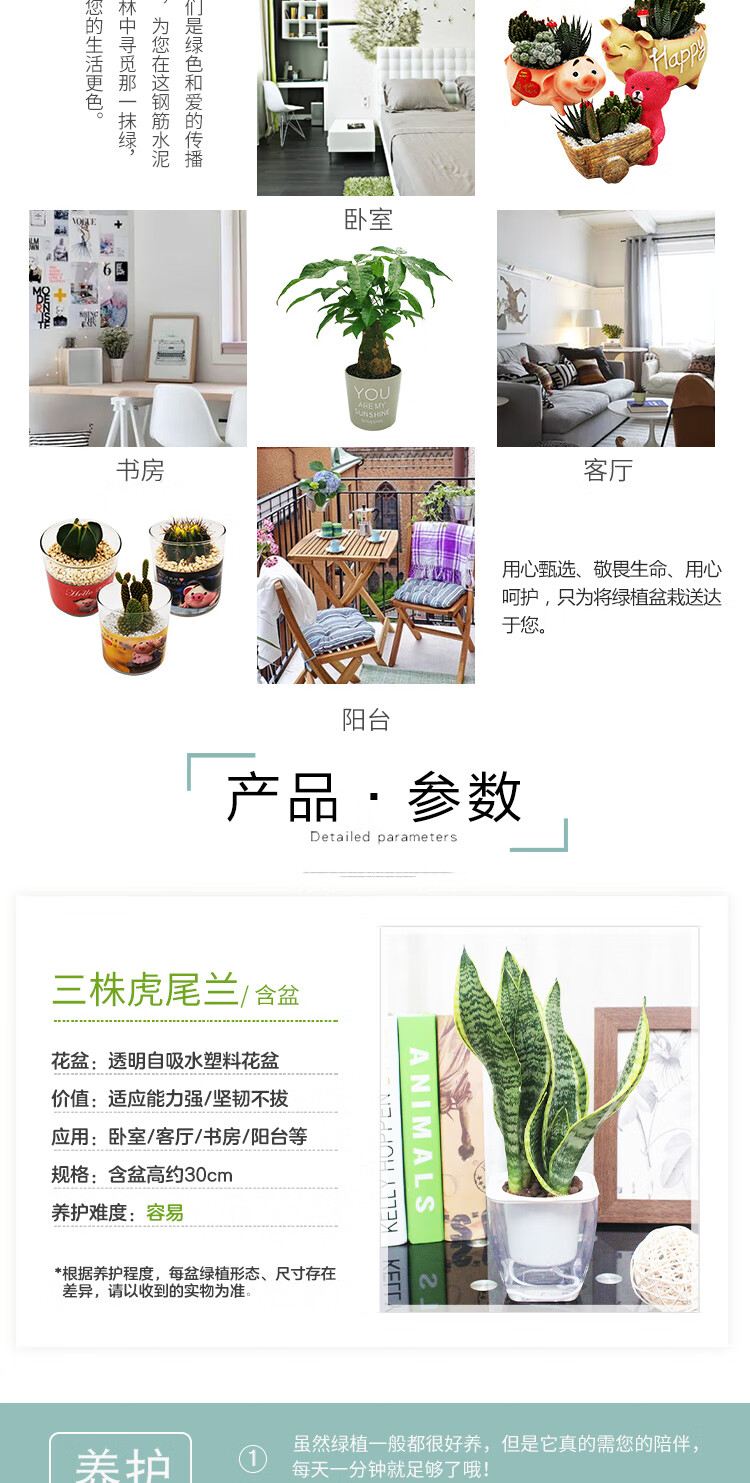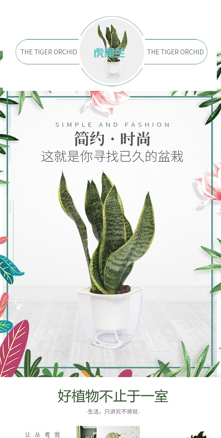 是否含花盆:带盆栽好;适用空间:庭院,阳台,客厅,办公桌,卧室,书房;植物品种:虎尾兰;植物类别:观叶植物;包装清单:三株虎尾兰×1、透明自吸水塑料花盆×1、包装箱×1;
