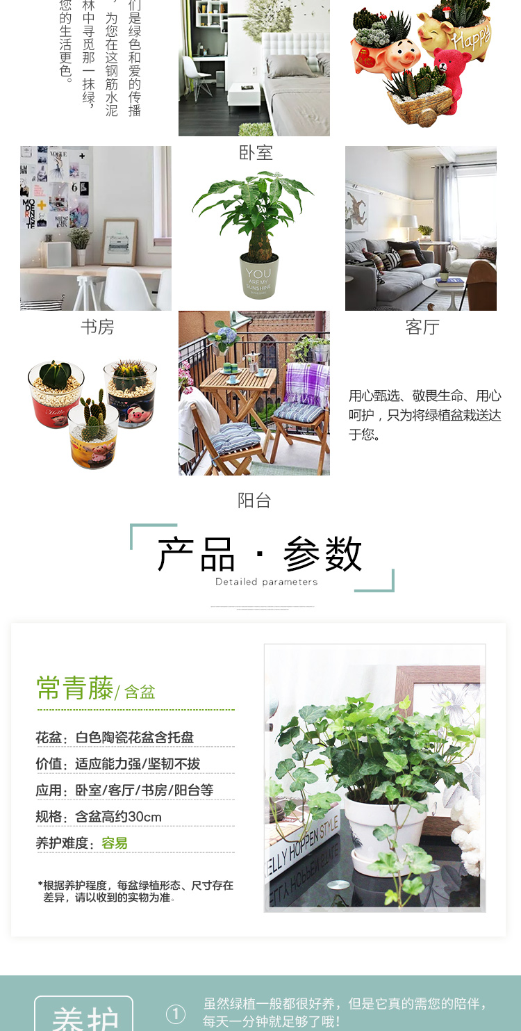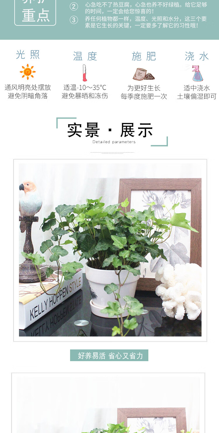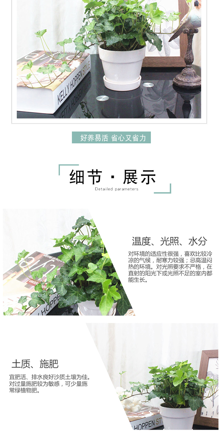 是否含花盆:带盆栽好;适用空间:庭院,阳台,客厅,办公桌,卧室,书房;植物品种:常春藤;植物类别:观茎植物;包装清单:常青藤×1、白色印花陶瓷花盆×1、包装箱×1;