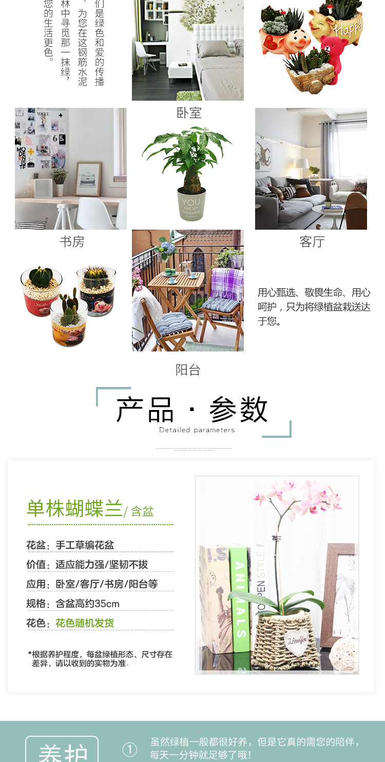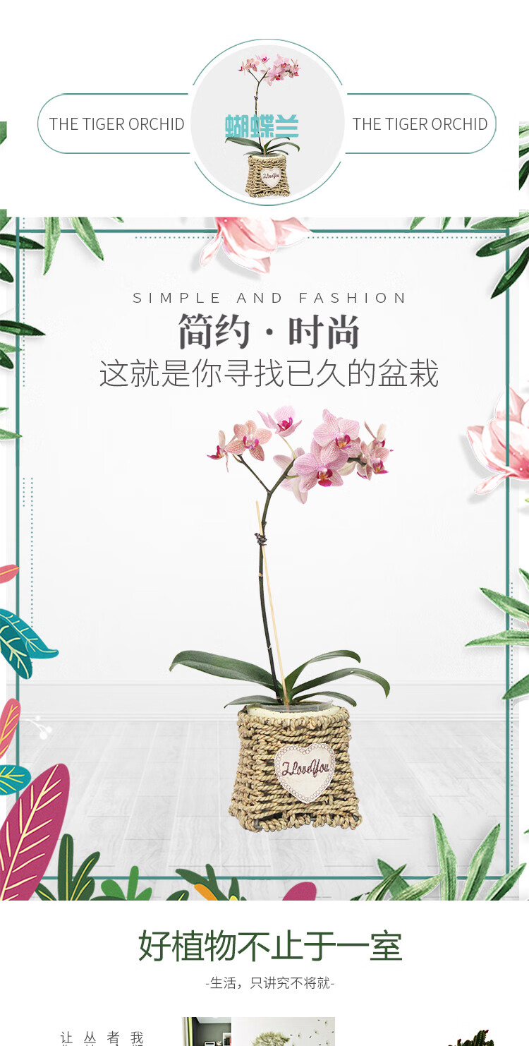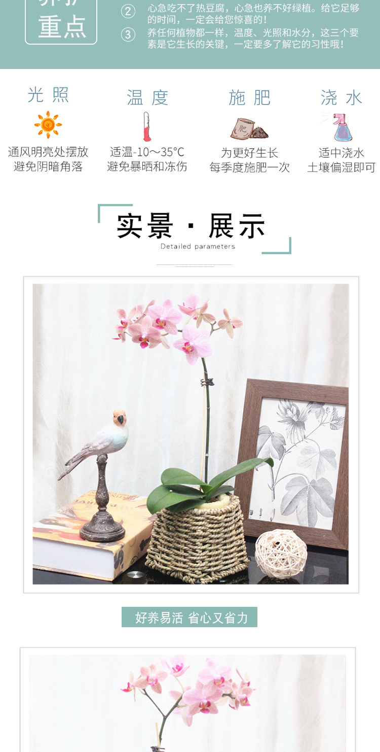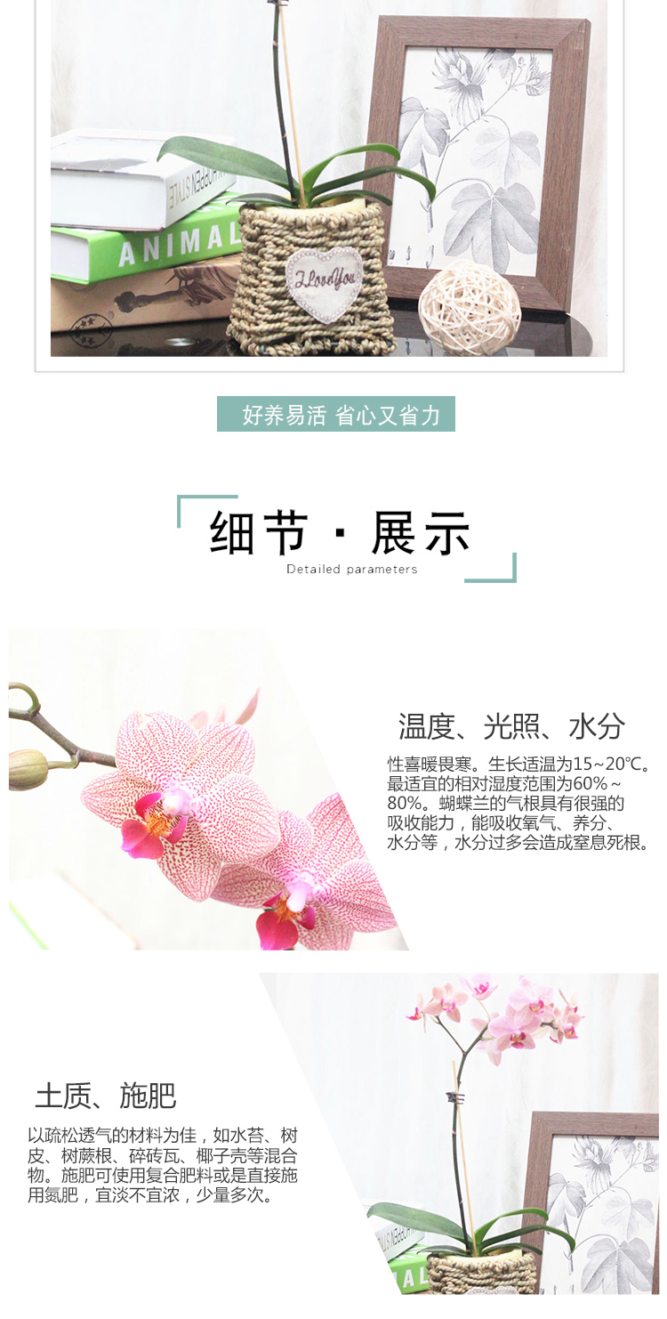 是否含花盆:带盆栽好;适用空间:庭院,阳台,客厅,办公桌,卧室,书房;植物品种:其它;植物类别:观叶植物;包装清单:单株蝴蝶兰×1、草编花盆×1、包装箱×1;