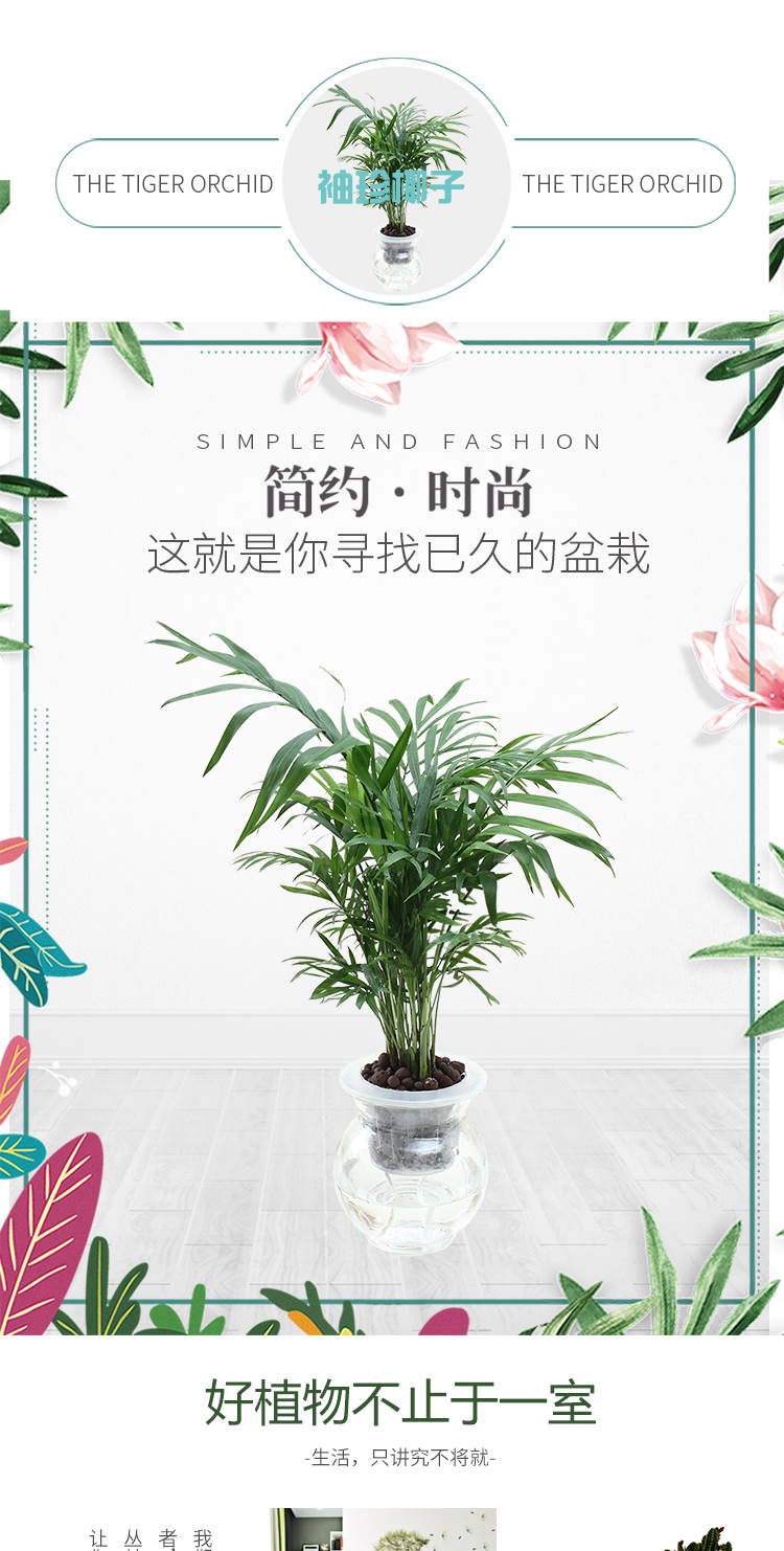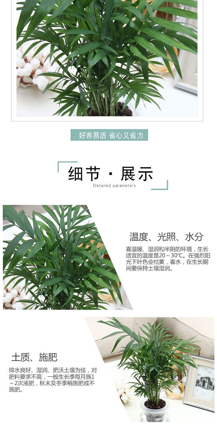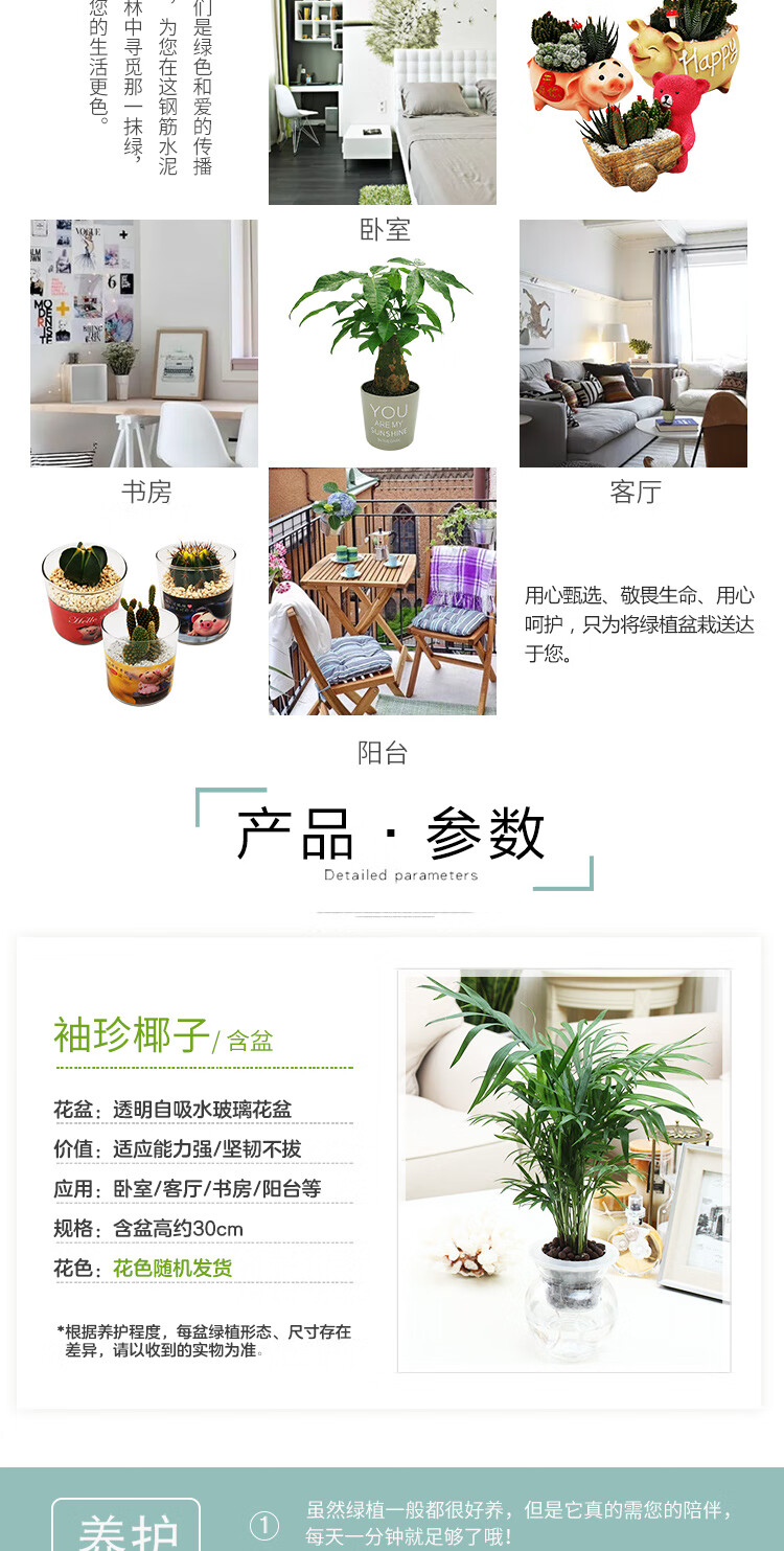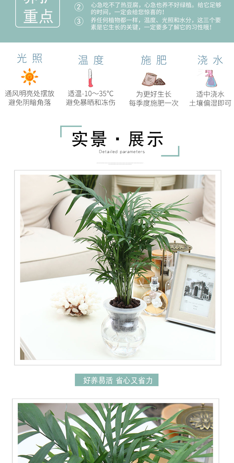 是否含花盆:带盆栽好;适用空间:庭院,阳台,客厅,办公桌,卧室,书房;植物品种:袖珍椰子;植物类别:观叶植物;包装清单:袖珍椰子×1、自吸水玻璃花盆×1、包装箱×1;
