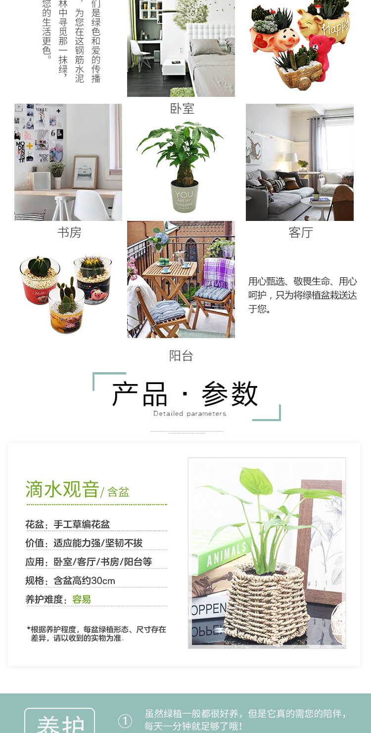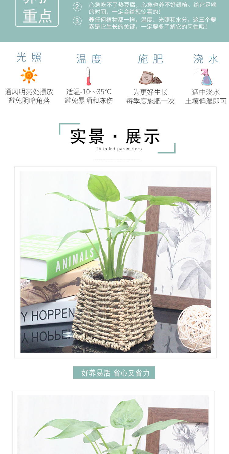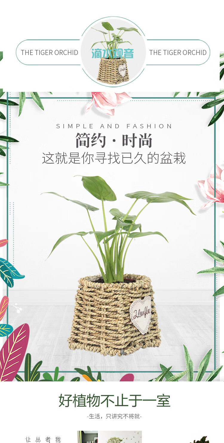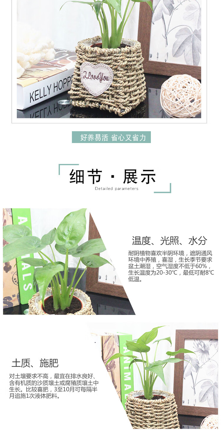是否含花盆:带盆栽好;适用空间:庭院,阳台,客厅,办公桌,卧室,书房;植物品种:其它;植物类别:观叶植物;包装清单:滴水观音×1、草编花盆×1、包装箱×1;