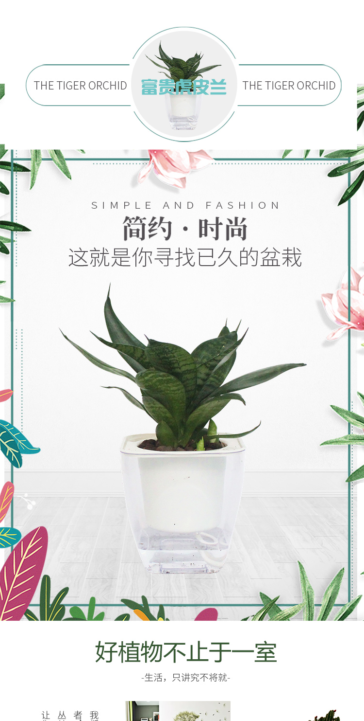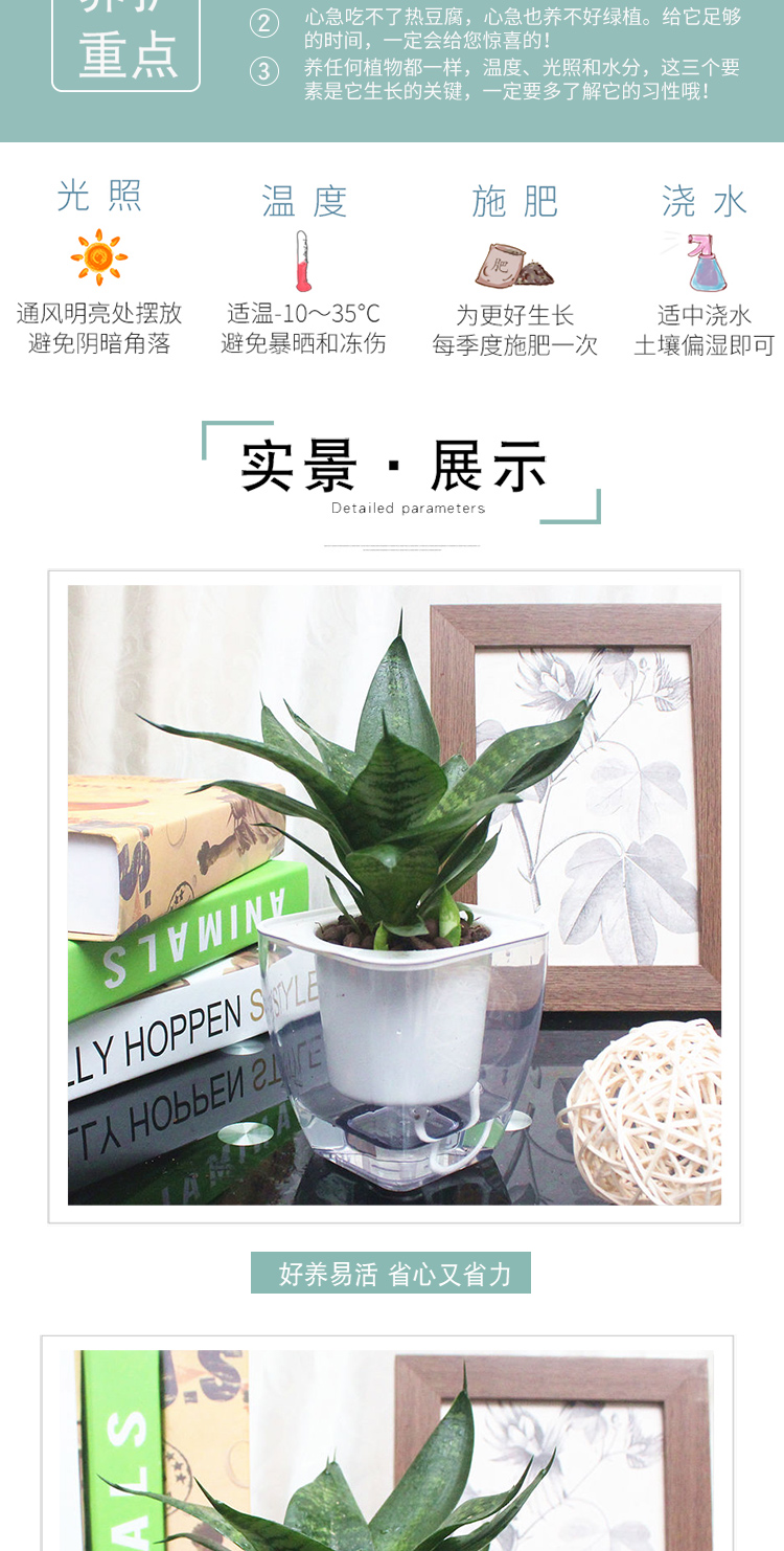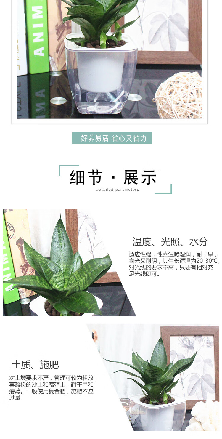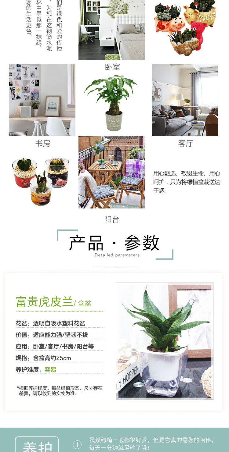 是否含花盆:带盆栽好;适用空间:庭院,阳台,客厅,办公桌,卧室,书房;植物品种:虎尾兰;植物类别:观叶植物;包装清单:富贵虎皮兰×1、透明自吸水塑料花盆×1、包装箱×1;