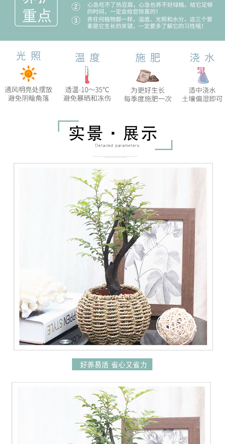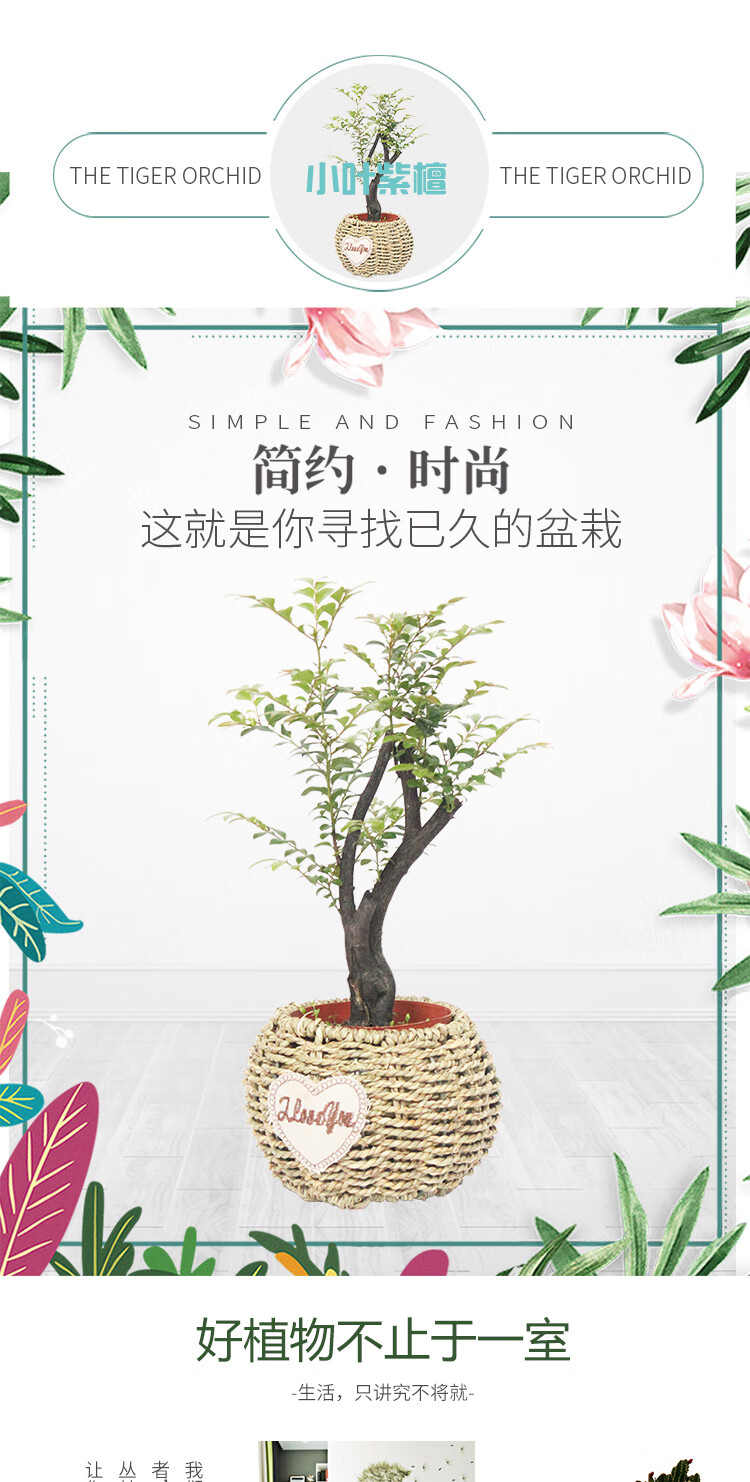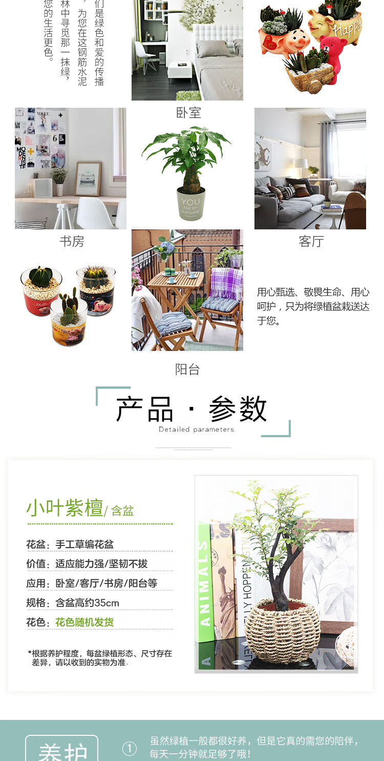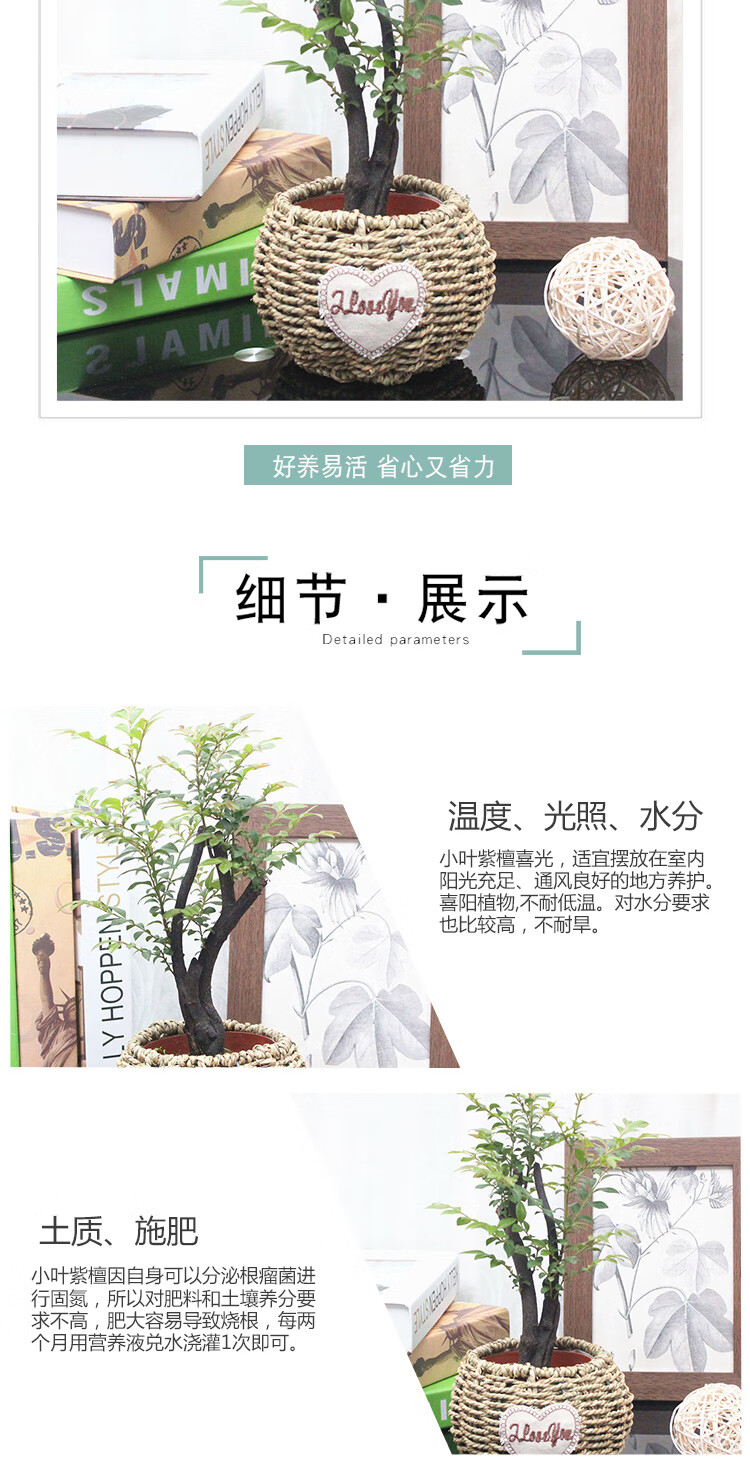 是否含花盆:含盆;适用空间:庭院,阳台,客厅,办公桌,卧室,书房;植物品种:小叶紫檀;植物类别:观叶植物;包装清单:小叶紫檀×1、草编花盆×1、包装箱×1;