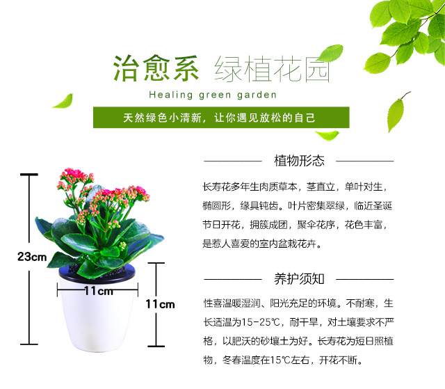 是否含花盆:含盆;植物品种:其它;植物类别:观叶植物;适用空间:阳台,卧室,书房,客厅,办公桌;包装清单:长寿花x1,花盆x1;