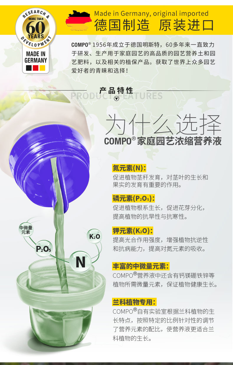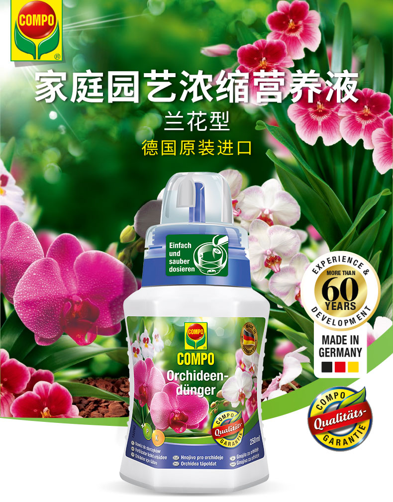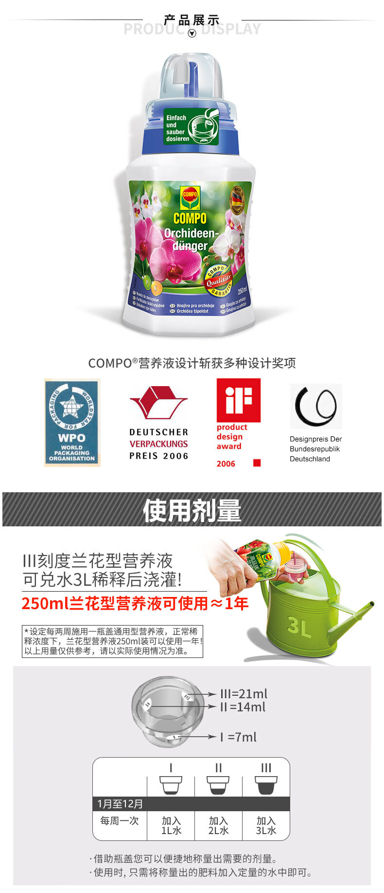类型:其它;品牌:COMPO;包装清单:德国进口COMPO 家庭园艺兰花型水溶肥料兰科植物专用营养液 250ml*1;