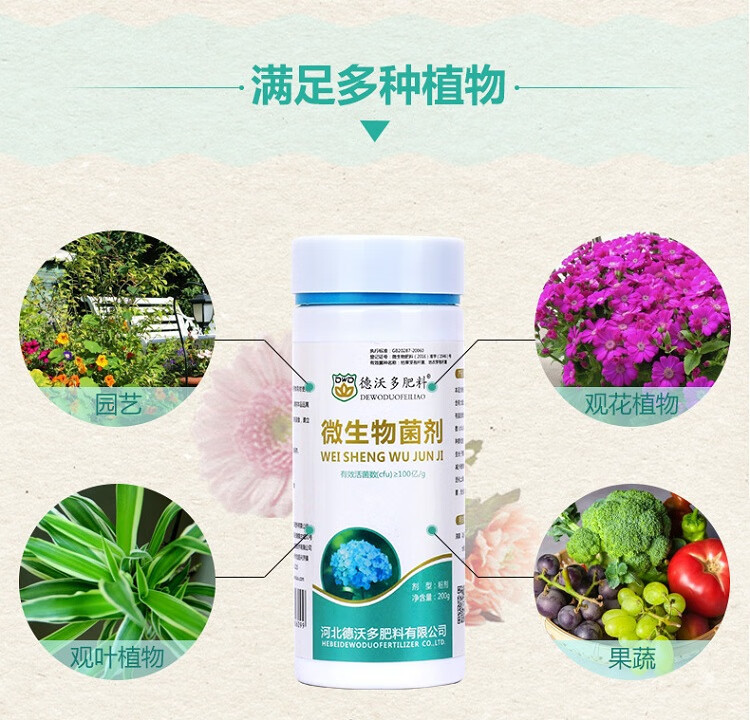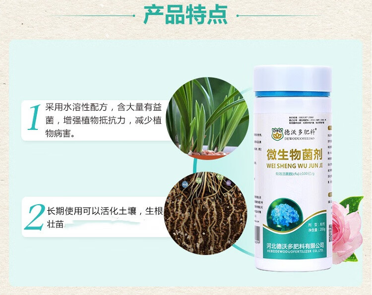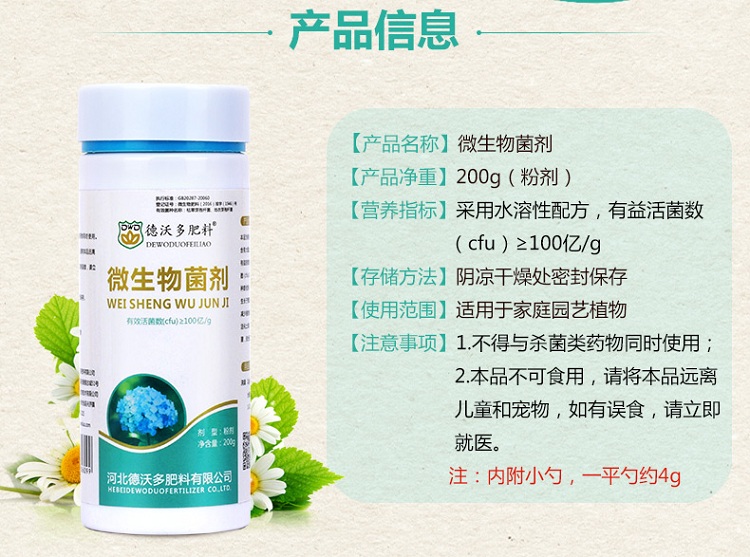 性状:固体;营养类型:水溶性肥料;适用对象:多肉植物,兰科植物,通用型,水培型,蔬菜水果,观花植物,观叶植物,苗木,盆景,其它;品牌:德沃多;包装清单:微生物菌剂200g*1;