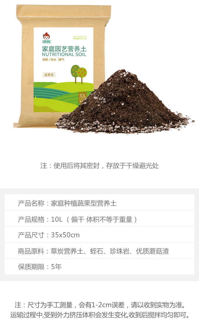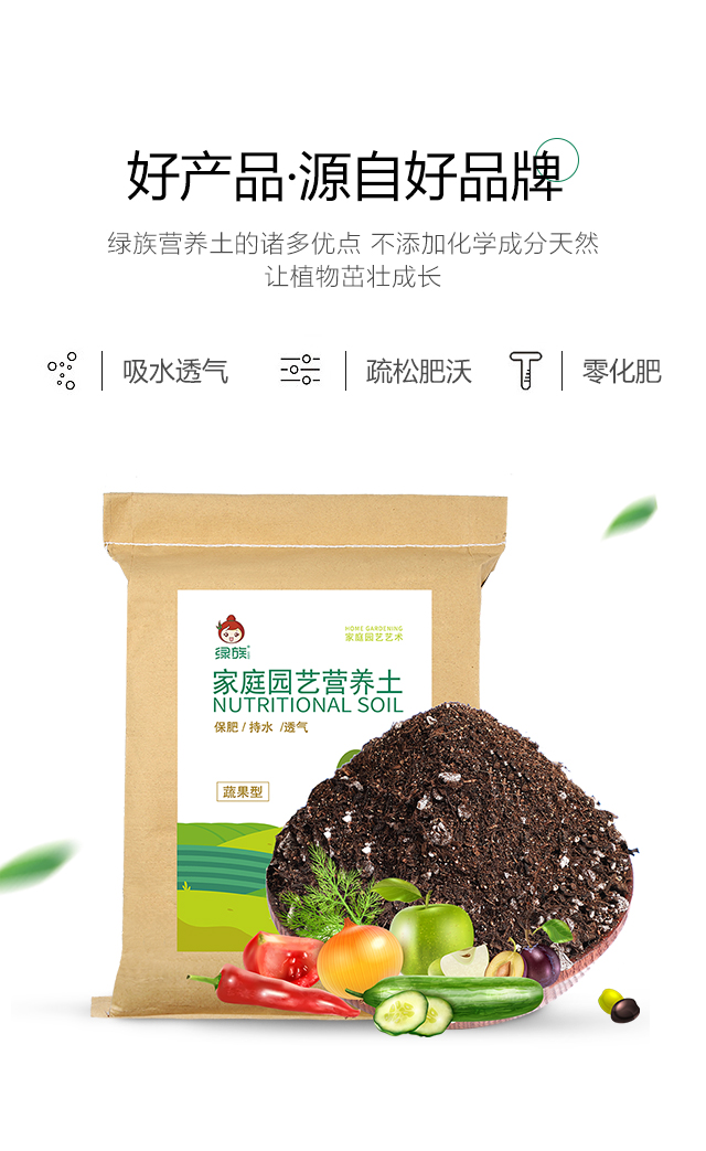 类型:复合基质;品牌:绿族;包装清单:家庭园艺营养土蔬果型10L*1袋;