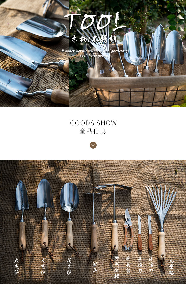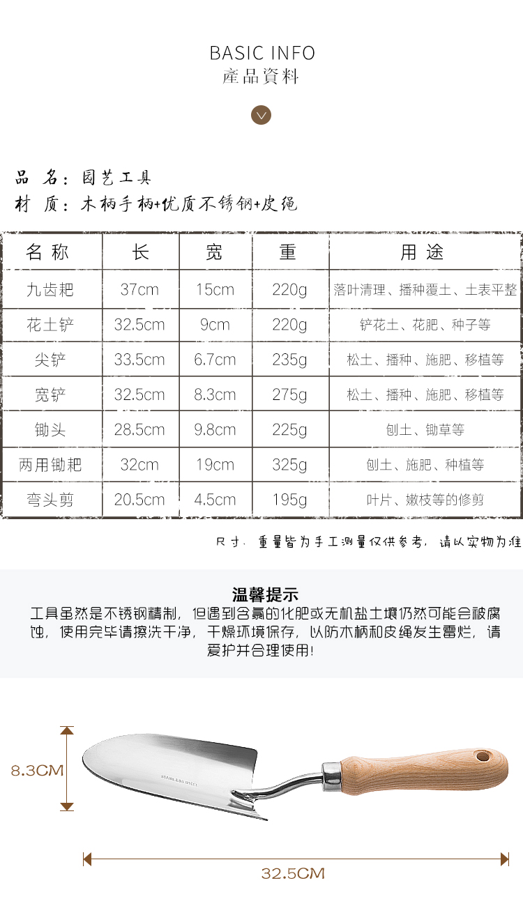 分类:铲/耙/锹/锄;品牌:芷郁;包装清单:木柄不锈钢宽铲X1;