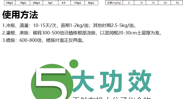 适用作物:粮食作物,经济作物,蔬菜,果树;施用方法:追施,叶面喷施,冲施,滴灌;包装清单:1kg/瓶,12瓶/箱;