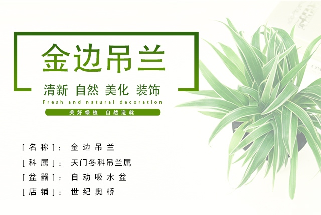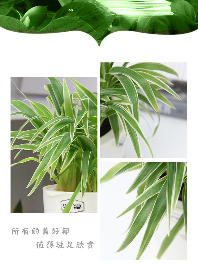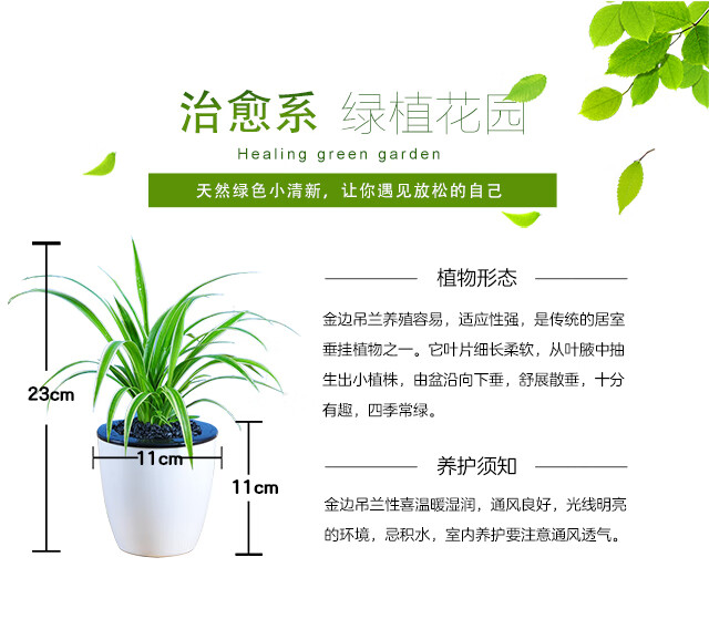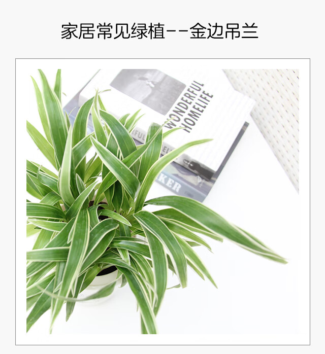 是否含花盆:含盆;适用空间:阳台,客厅,办公桌,卧室,书房;植物品种:吊兰;植物类别:观叶植物;包装清单:金边吊兰x1,花盆x1;