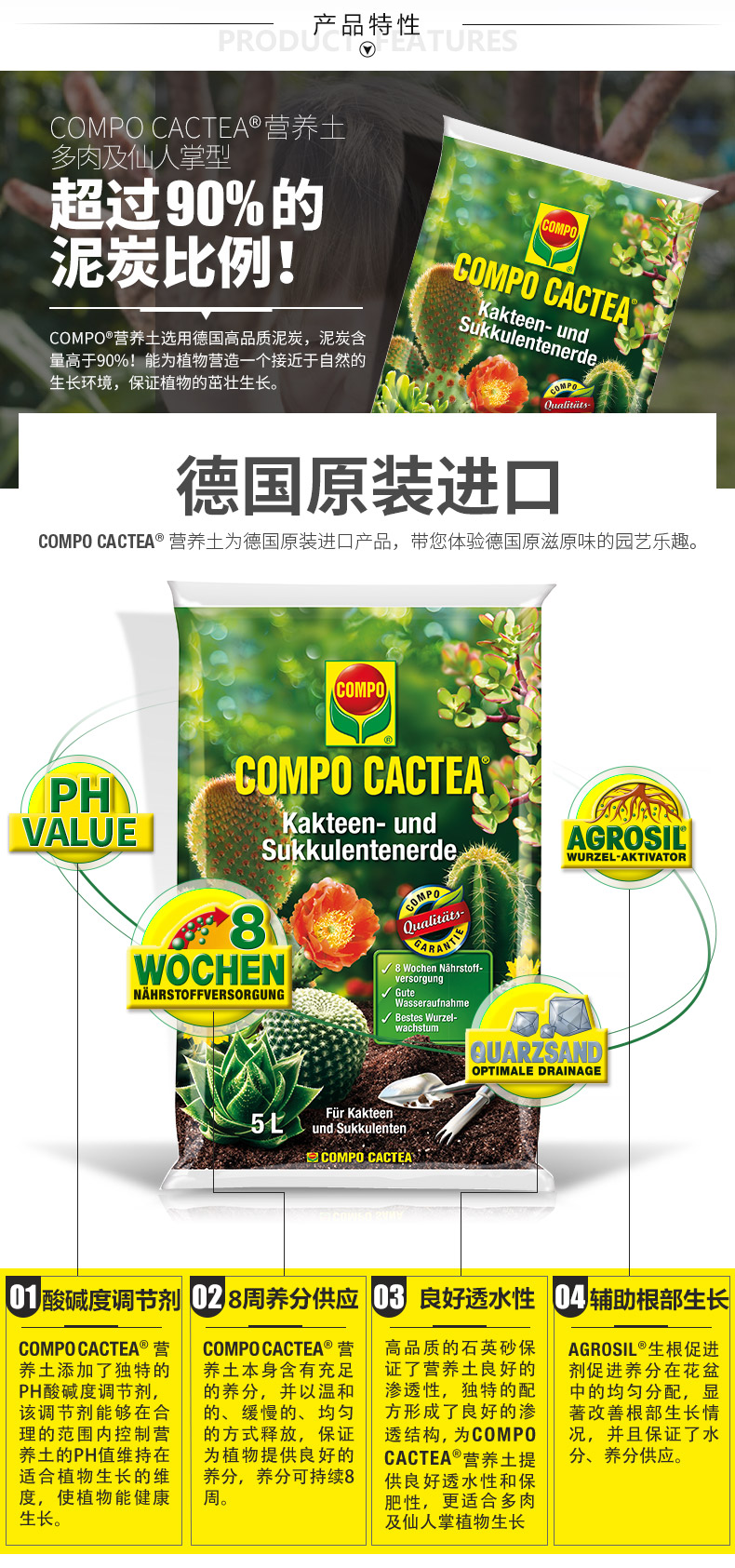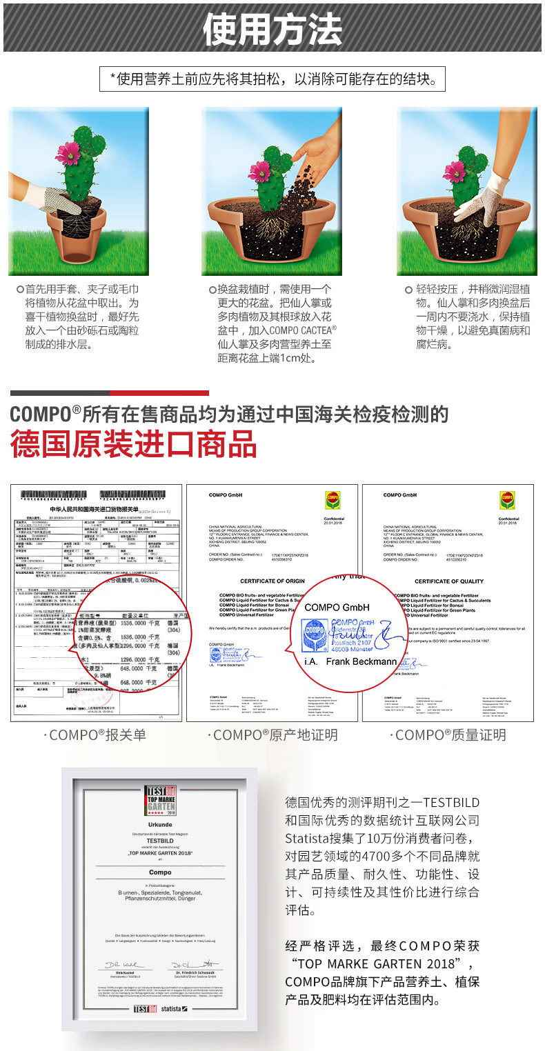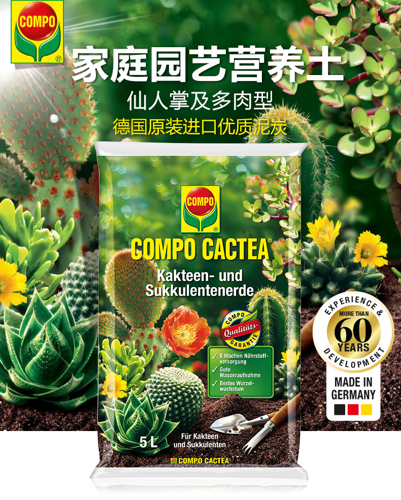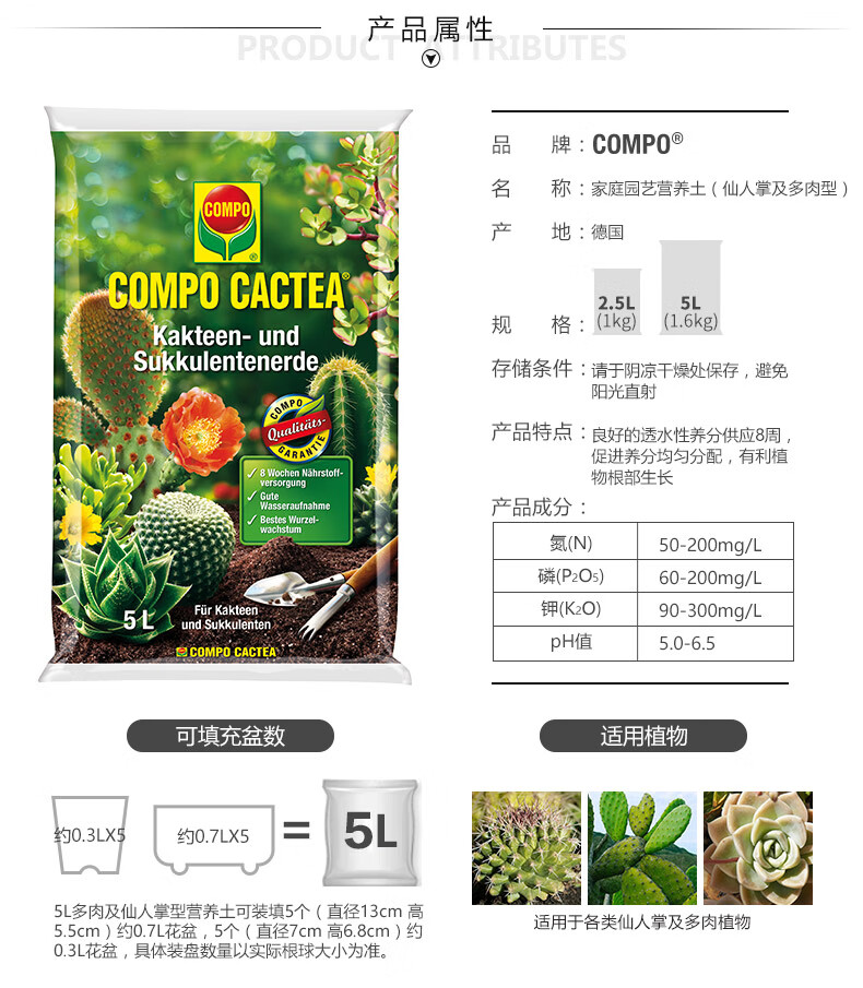 适用对象:多肉植物;性状:固体;营养类型:其它;品牌:COMPO;包装清单:COMPO 家庭园艺仙人掌多肉植物泥炭土阳台种植营养土 5L*1;