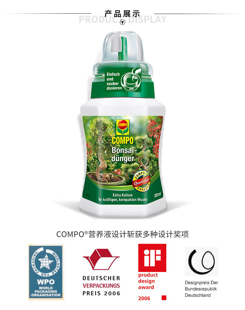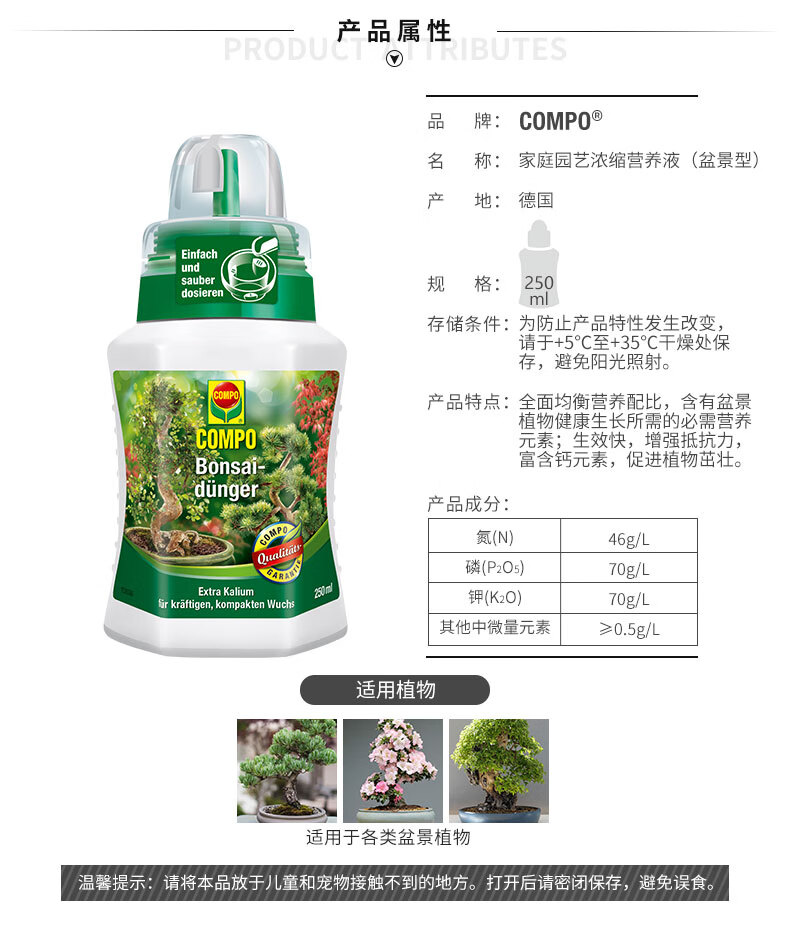 类型:其它;品牌:COMPO;包装清单:COMPO 家庭园艺水溶复合肥料盆景植物专用营养液 250ml*1;