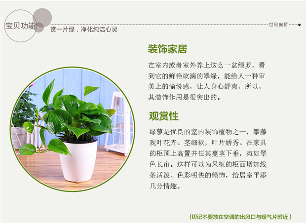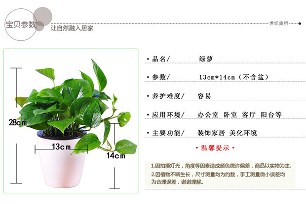 是否含花盆:含盆;适用空间:阳台,客厅,办公桌,卧室,书房;植物品种:绿萝;植物类别:观叶植物;包装清单:绿萝X1 H003花盆X1;