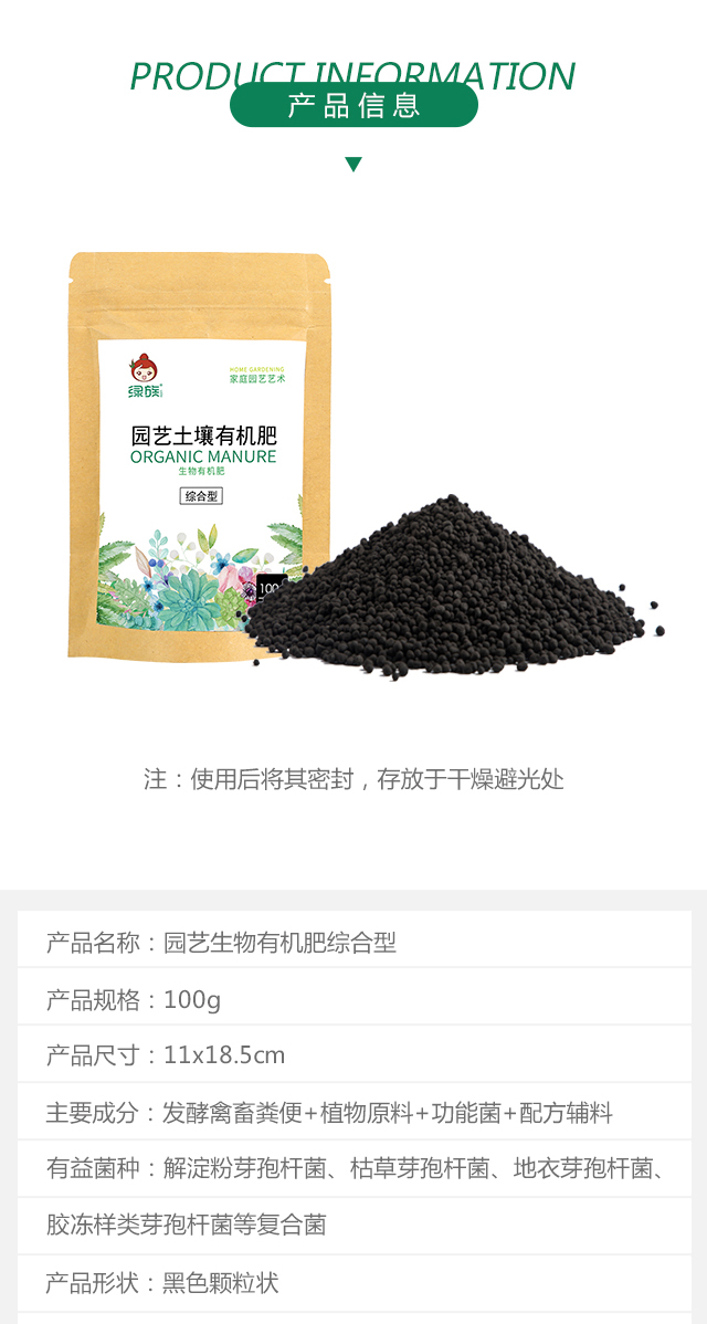 适用对象:通用型;性状:固体;营养类型:有机肥;品牌:绿族;包装清单:园艺土壤有机肥综合型100g*1包;