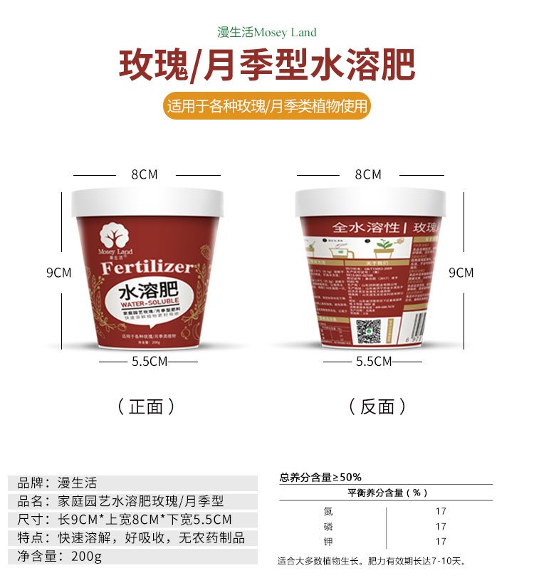 性状:固体;营养类型:水溶性肥料;适用对象:观花植物,盆景,其它;品牌:漫生活;包装清单:玫瑰月季型肥料200g/瓶;