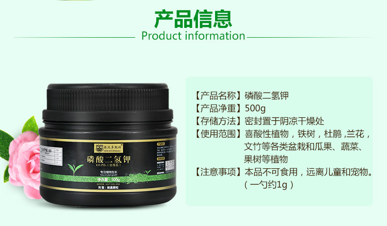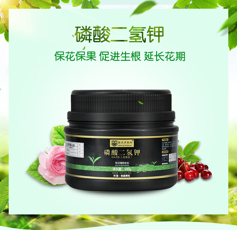 适用对象:观花植物,通用型;性状:固体;营养类型:微量元素肥料;品牌:德沃多肥料;包装清单:磷酸二氢钾500g*1;