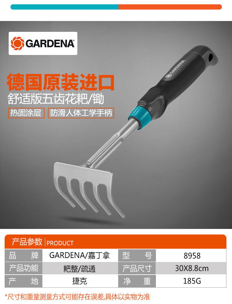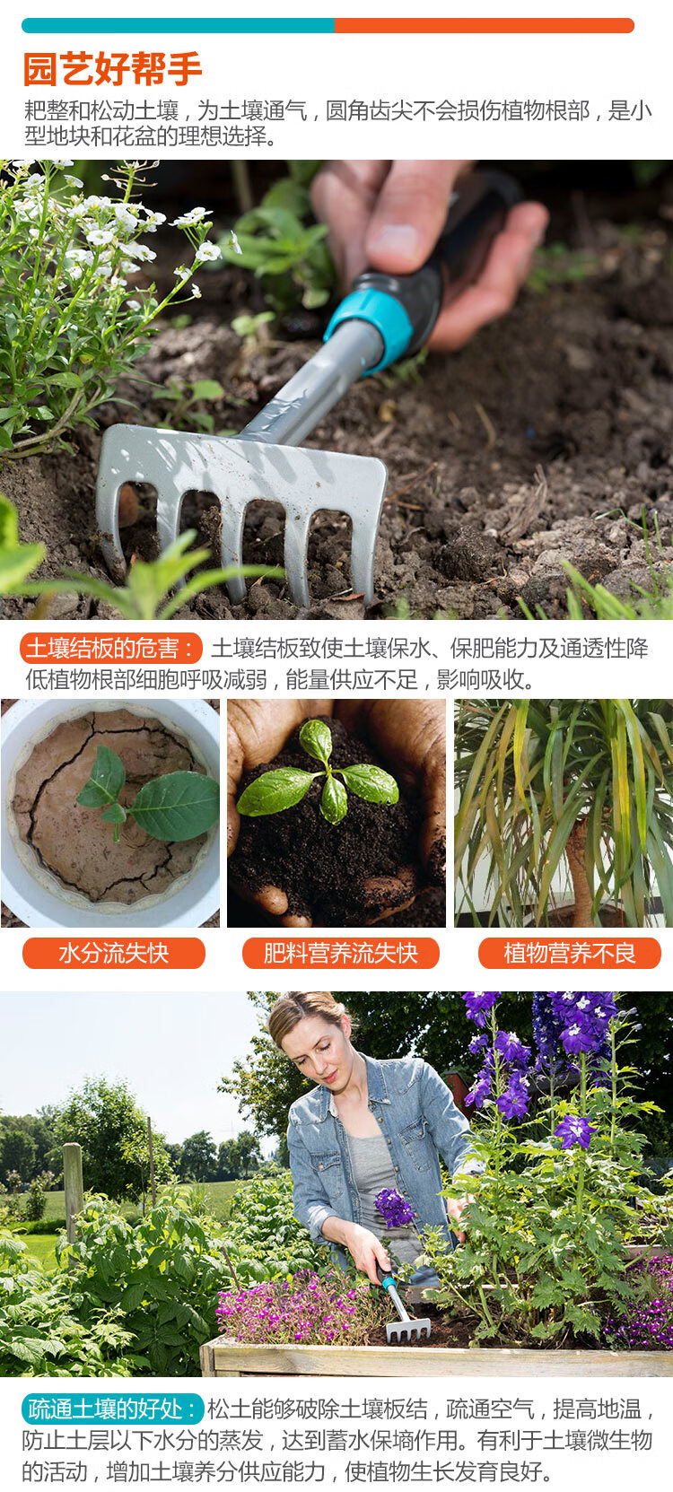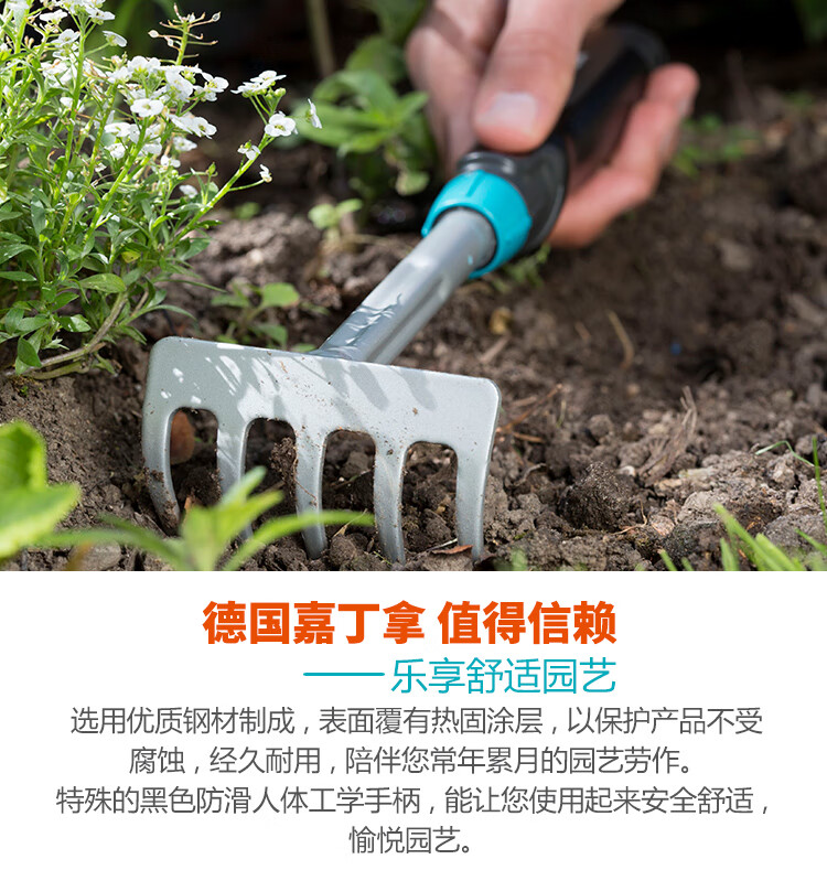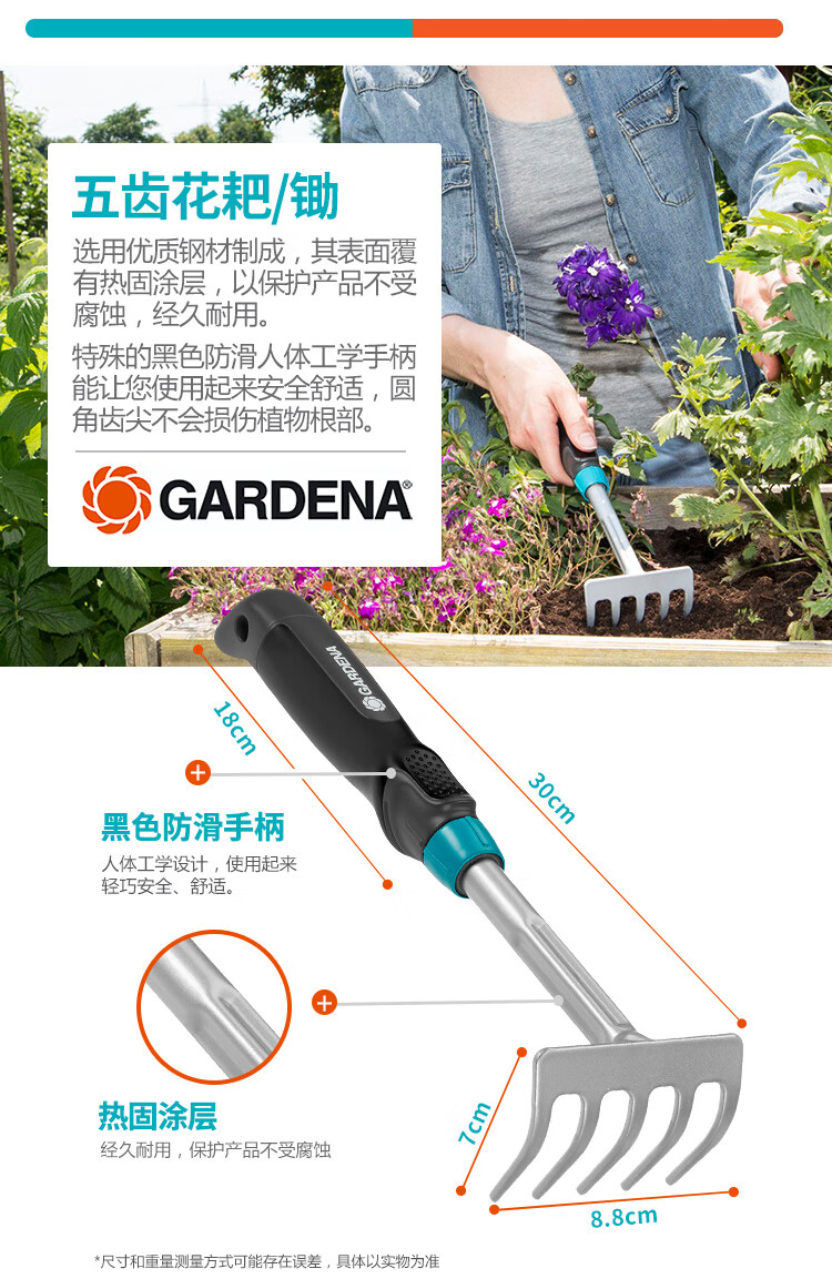 铲/耙/锹/锄:锄;洒水浇水壶:其它;分类:铲/耙/锹/锄;材质:其它;刀/剪/锯:盆景工具;产地:进口;品牌:嘉丁拿(GARDENA);包装清单:嘉丁拿进口五齿花耙*1;
