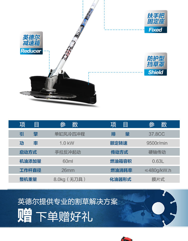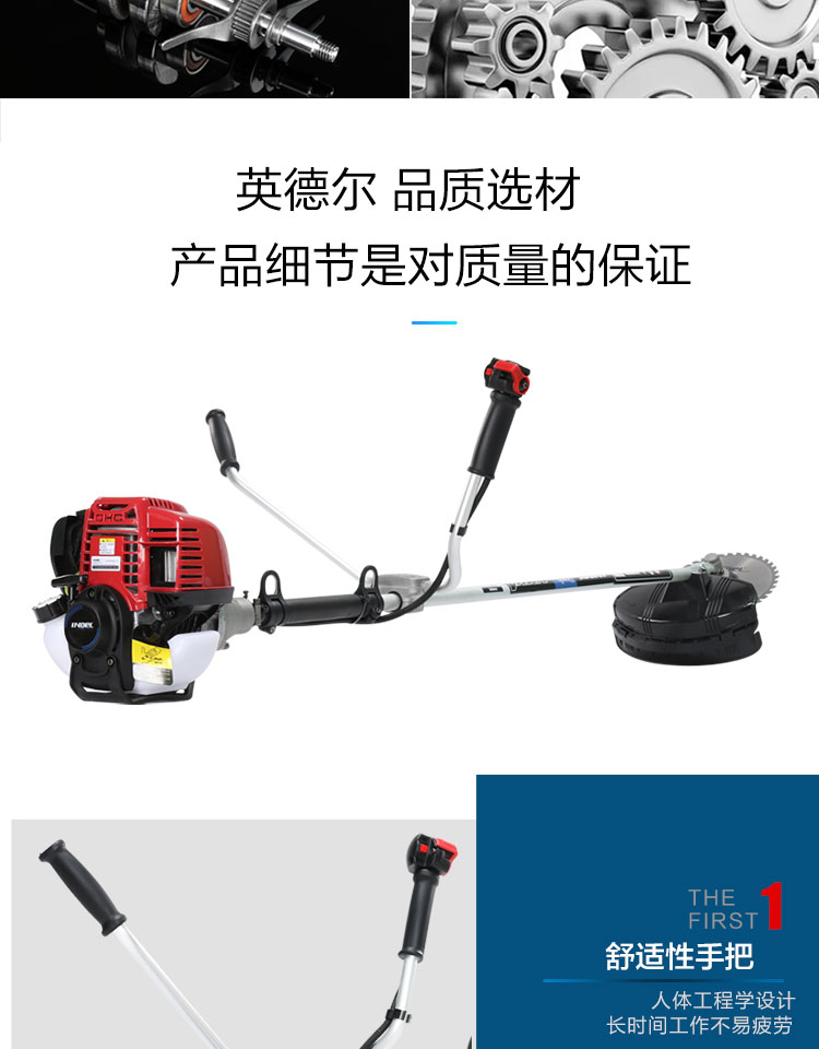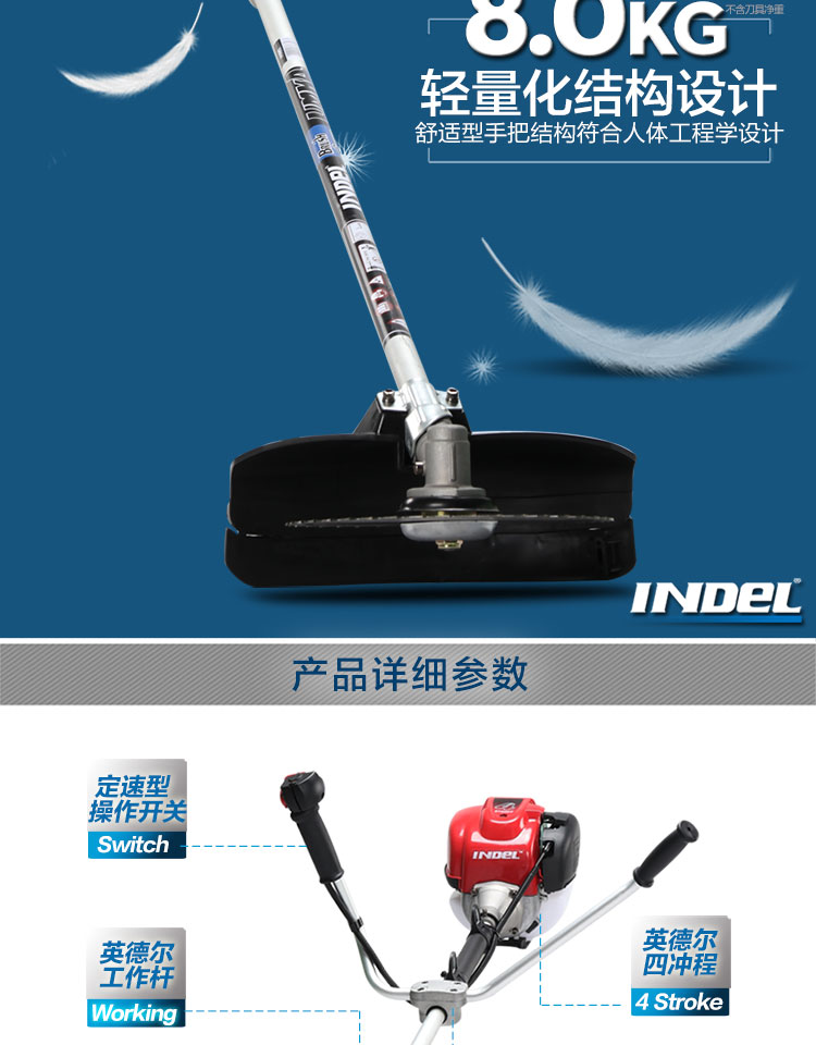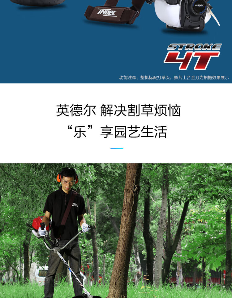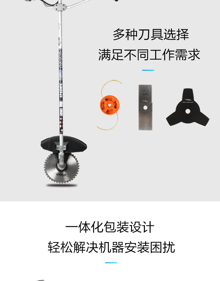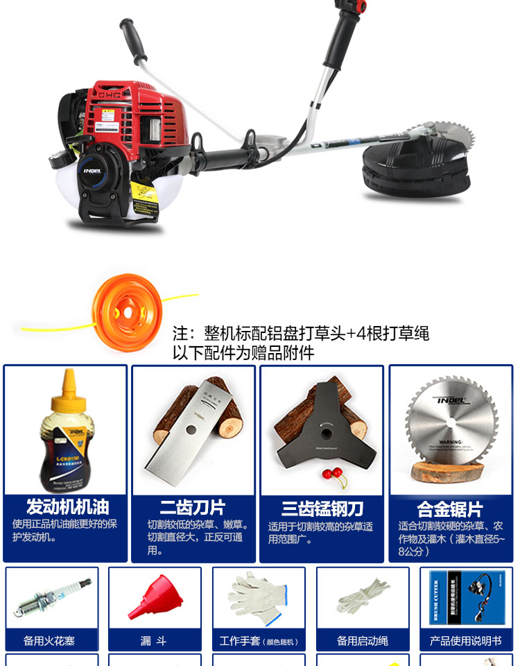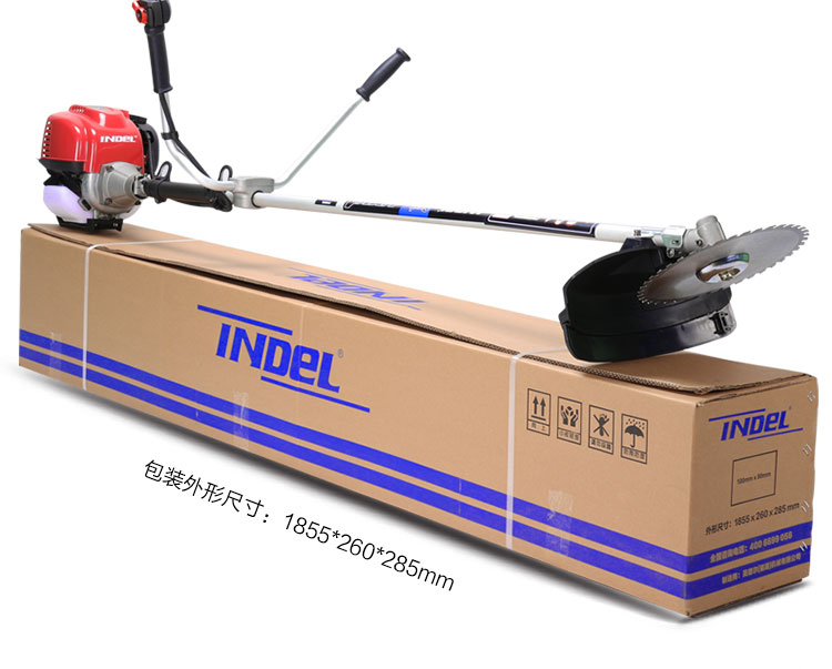 行进方式:智能化半自动式拖行式;动力类型:发动机驱动;包装清单:割草机*1、合金锯片*1、英德尔原装一字刀*1、英德尔3T锰钢刀*1、漏斗*1、火花塞*1、手套*1、离合碟弹簧*1、启动拉绳*1、刀片保护罩*1、刀片防松螺母*1、刀片止退垫片*1、离合器波垫*2、油管*2、M5备用螺丝*2、M6备用螺丝*2、铝盘打草头*1、挡草罩*1、套筒扳手*1、扎带*2、双用螺丝刀*1、护目镜*1、M4内六角扳手*1、M5内六角扳手*1、高档防水工具包*1、使用说明书*1;
