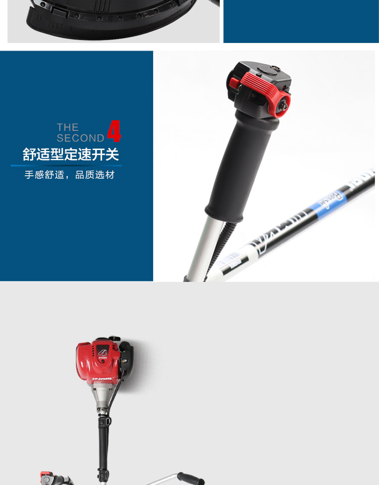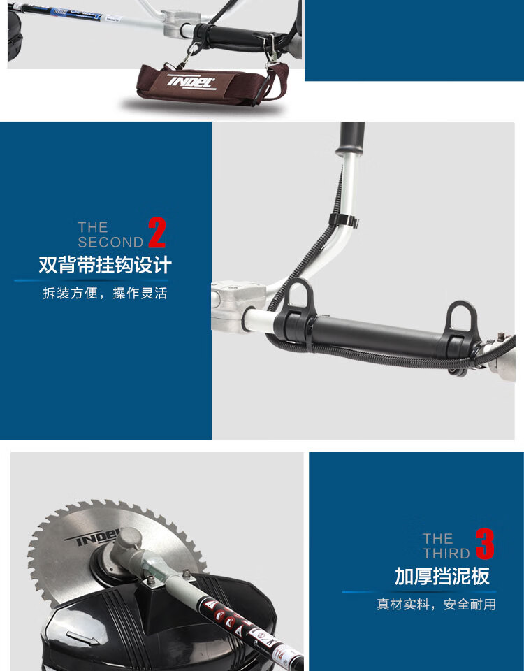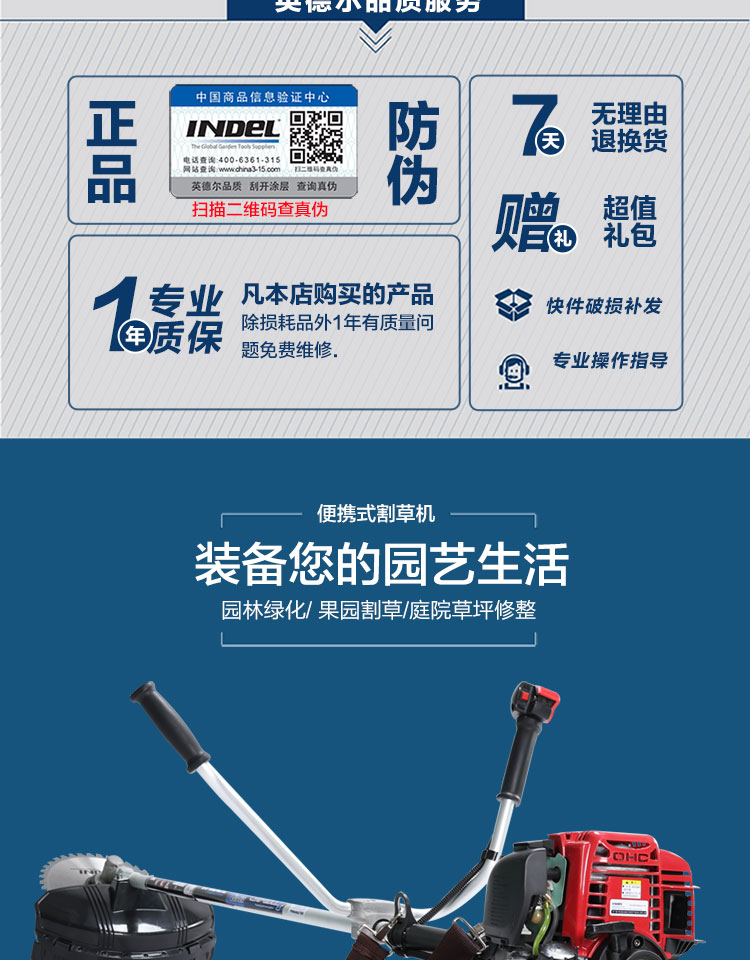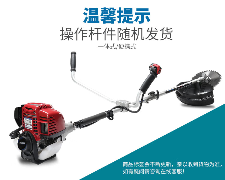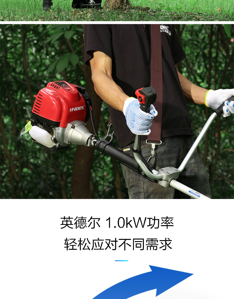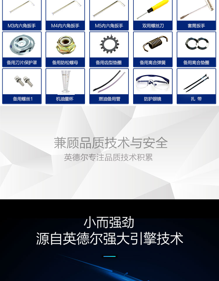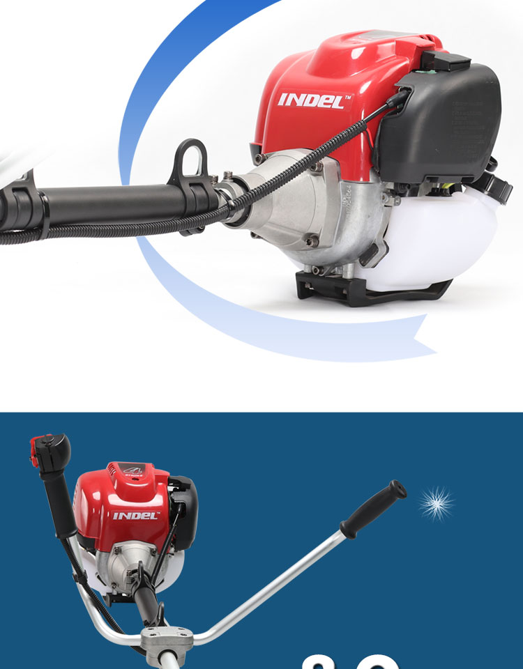 行进方式:智能化半自动式拖行式;动力类型:发动机驱动;包装清单:割草机*1、合金锯片*1、英德尔原装一字刀*1、英德尔3T锰钢刀*1、漏斗*1、火花塞*1、手套*1、离合碟弹簧*1、启动拉绳*1、刀片保护罩*1、刀片防松螺母*1、刀片止退垫片*1、离合器波垫*2、油管*2、M5备用螺丝*2、M6备用螺丝*2、铝盘打草头*1、挡草罩*1、套筒扳手*1、扎带*2、双用螺丝刀*1、护目镜*1、M4内六角扳手*1、M5内六角扳手*1、高档防水工具包*1、使用说明书*1;