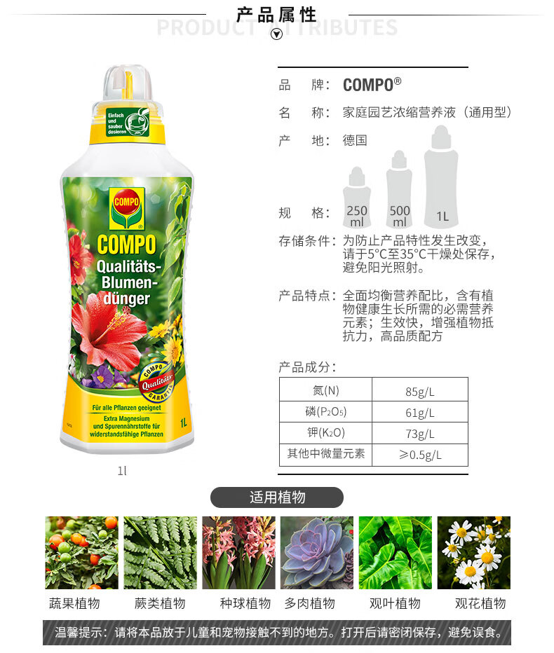 类型:其它;品牌:COMPO;包装清单:COMPO 家庭园艺盆栽肥料花卉植物液体肥通用型营养液 1L*1;