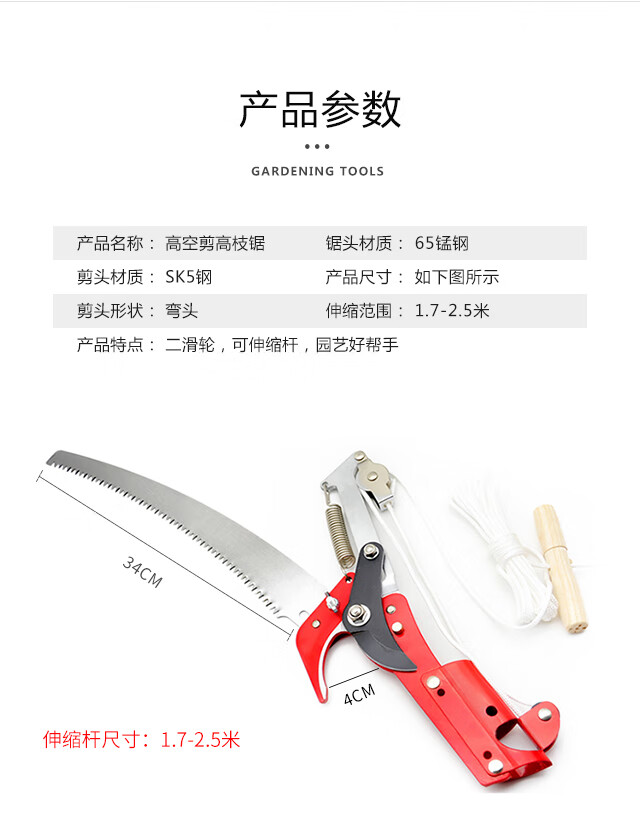 铲/耙/锹/锄:其它;洒水浇水壶:其它;分类:刀/剪/锯;材质:高碳钢/工具钢;刀/剪/锯:高空剪/锯;产地:国产;品牌:VMP;包装清单:高空锯(含锯片)一把,1.7-2.5米可伸缩杆;