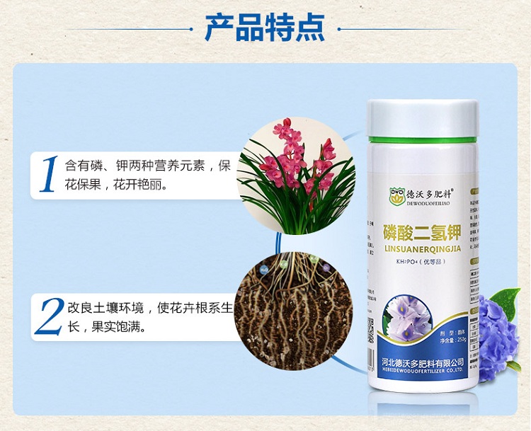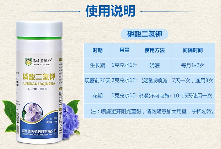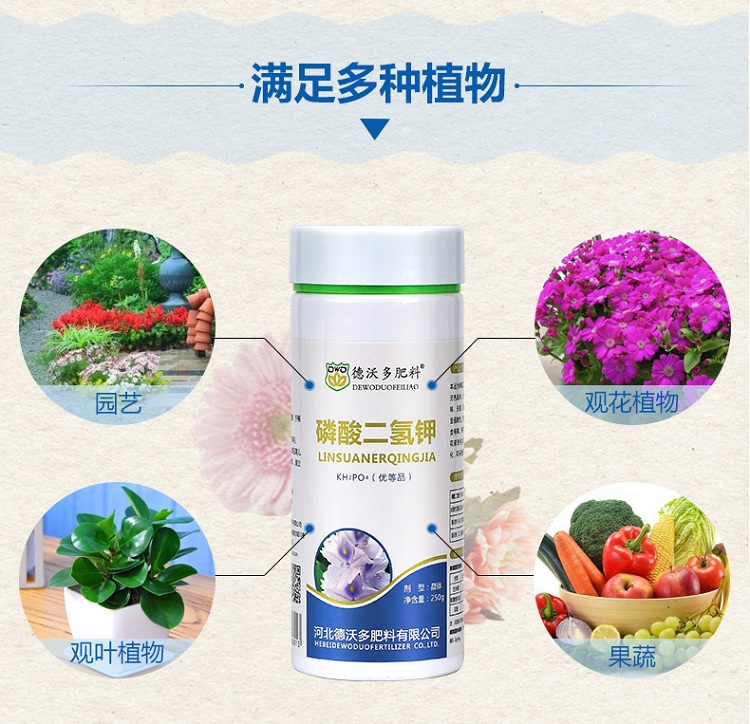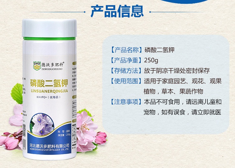 适用对象:通用型,观花植物;性状:固体;营养类型:无机肥;品牌:德沃多;包装清单:磷酸二氢钾250g*1;