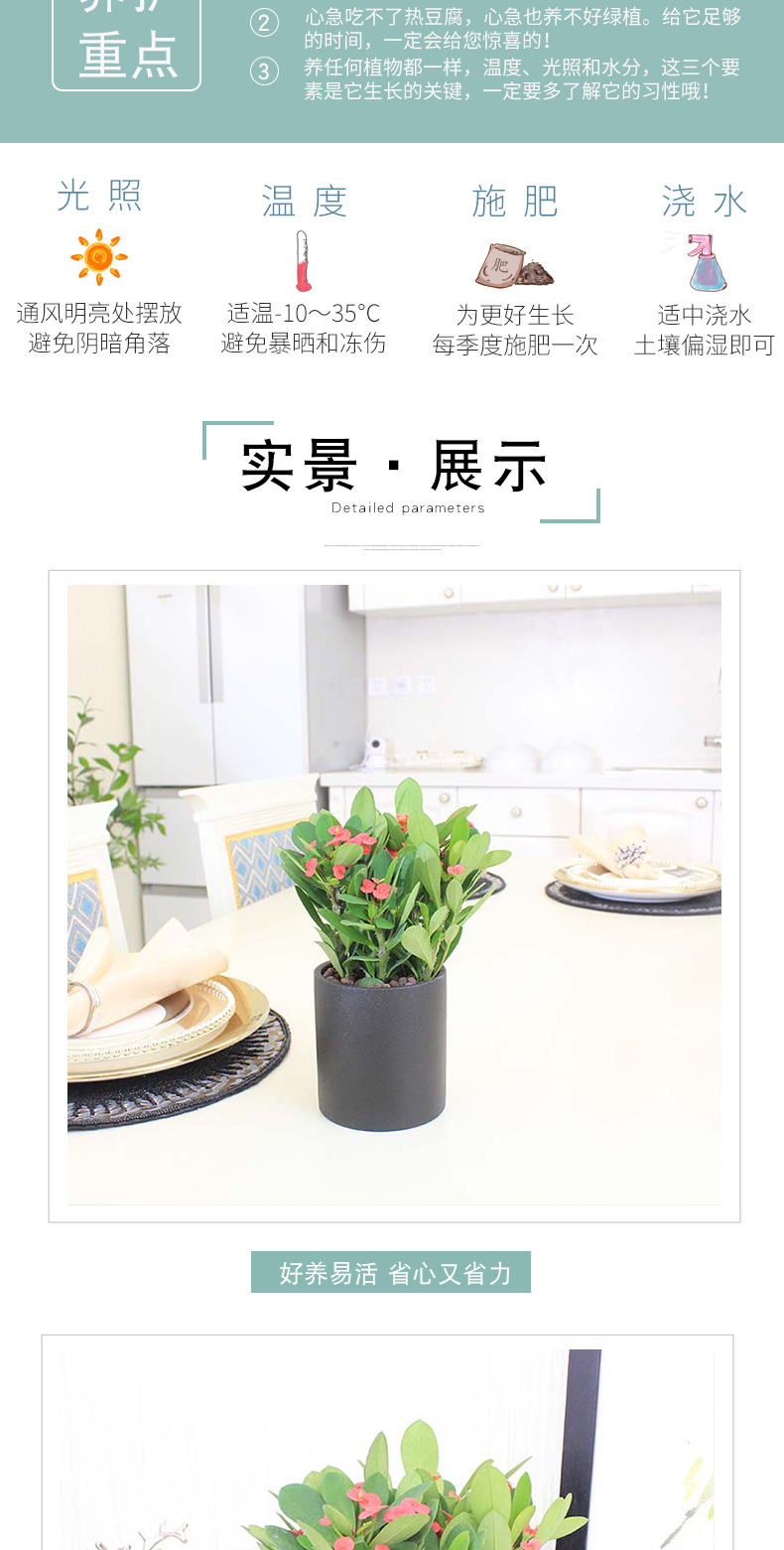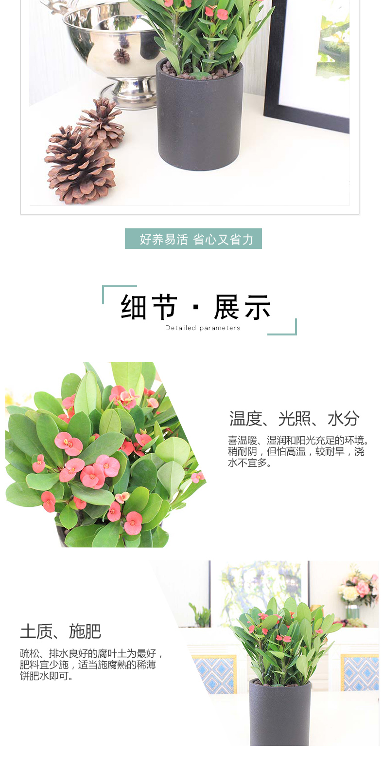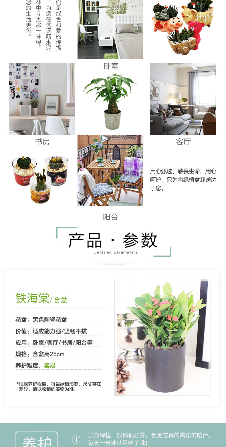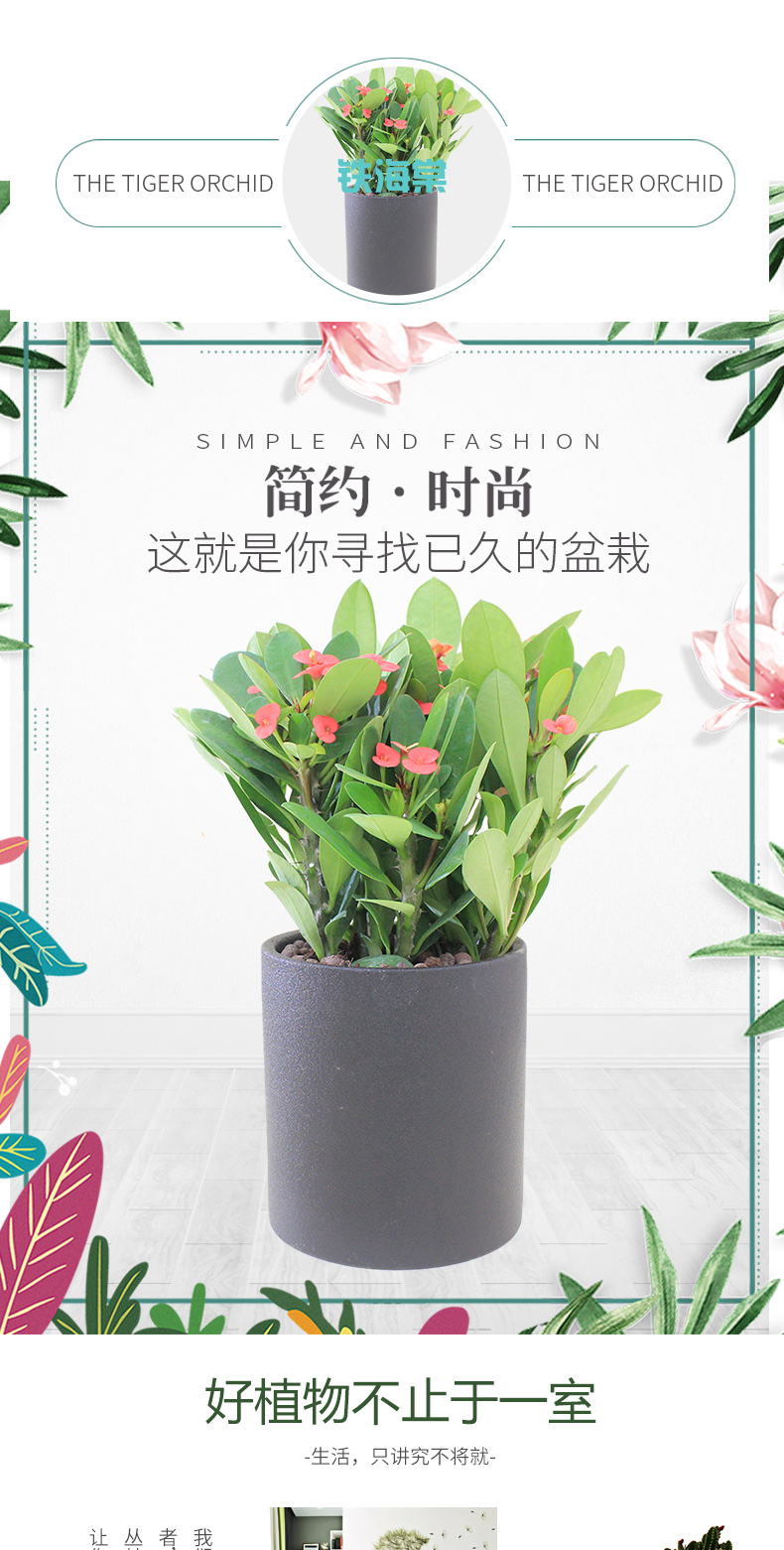 植物品种:其它;是否含花盆:带盆栽好;植物类别:观叶植物;适用空间:阳台,客厅,办公桌,书房;包装清单:铁海棠X1、黑陶花盆X1、包装箱X1。;