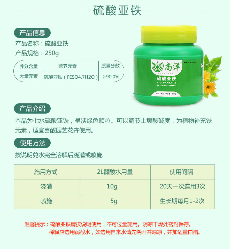 适用对象:通用型;性状:固体;营养类型:微量元素肥料;品牌:尚洋;包装清单:硫酸亚铁250g*1;