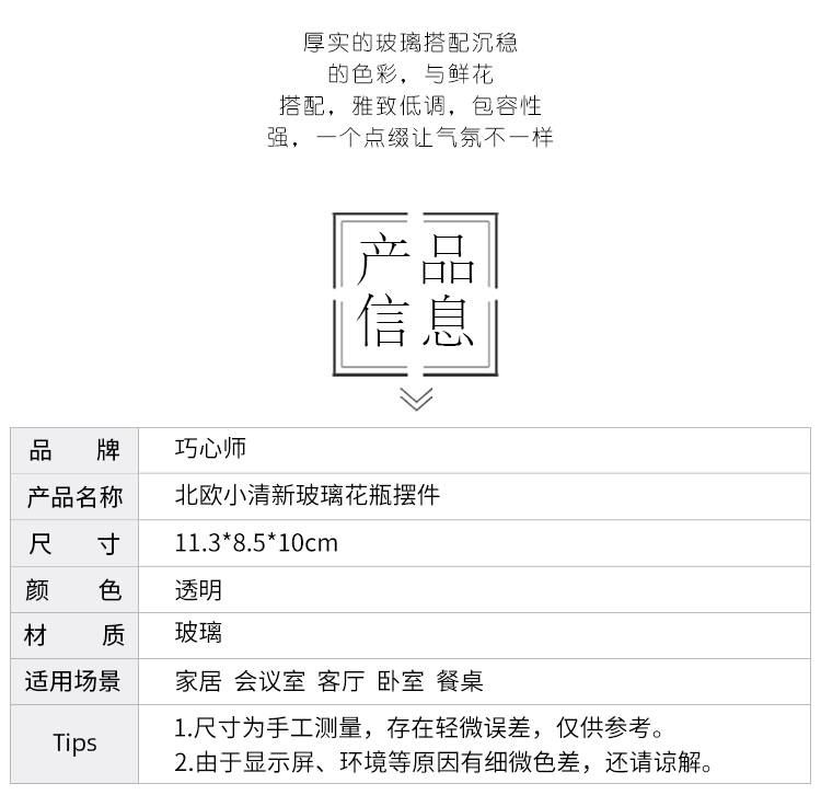 材质:玻璃;底部留孔:无孔;尺寸:11-15cm;品牌:巧心师;包装清单:花瓶;