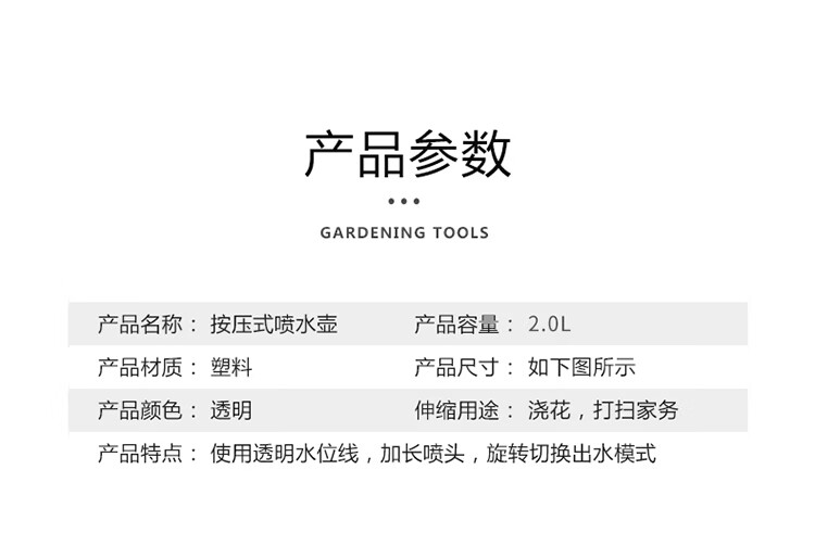 铲/耙/锹/锄:其它;洒水浇水壶:喷壶;分类:洒水浇水壶;材质:塑料;刀/剪/锯:其它;产地:国产;品牌:VMP;包装清单:压式喷水壶*1个;