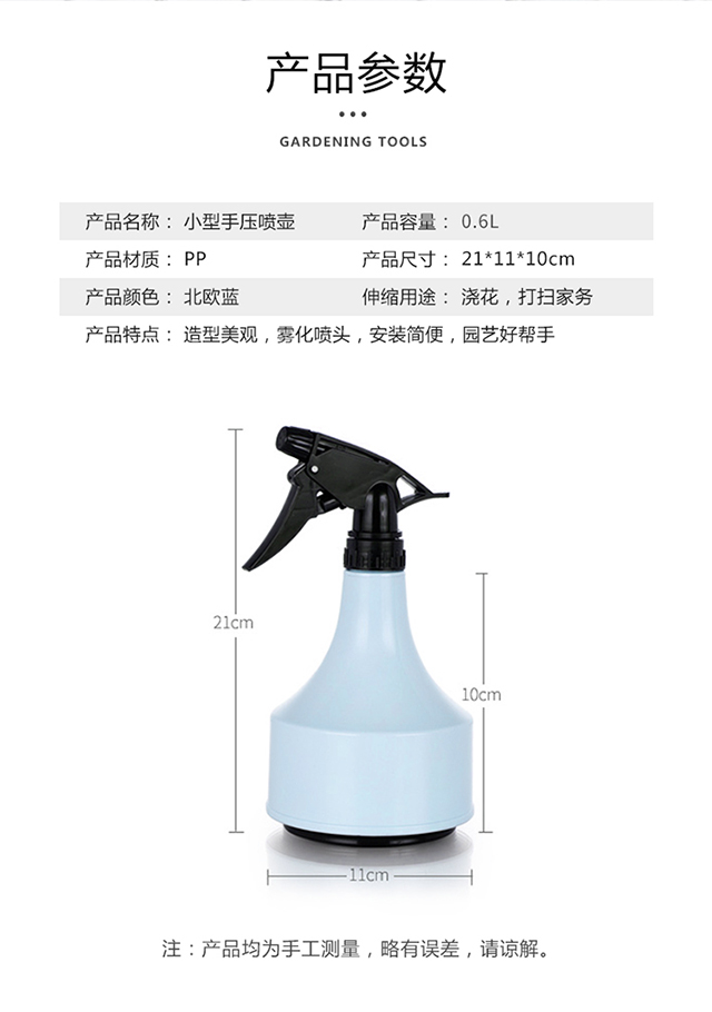 铲/耙/锹/锄:其它;洒水浇水壶:喷壶;分类:洒水浇水壶;材质:塑料;刀/剪/锯:其它;产地:国产;品牌:VMP;包装清单:小型手压喷壶*1个;