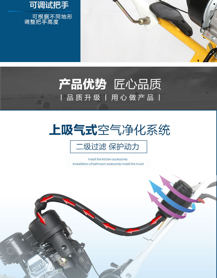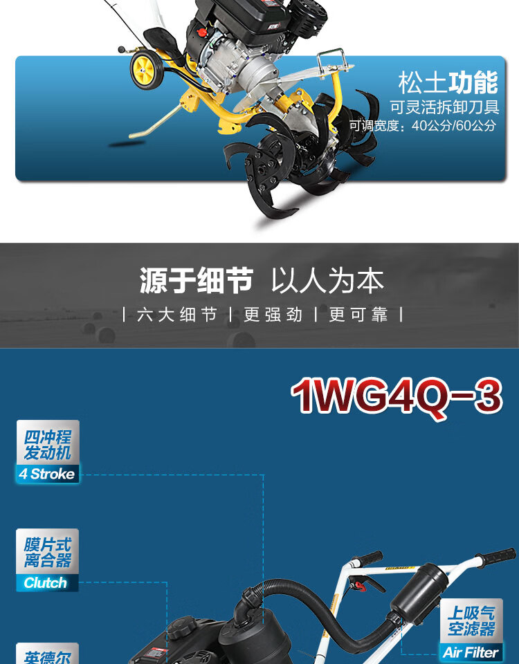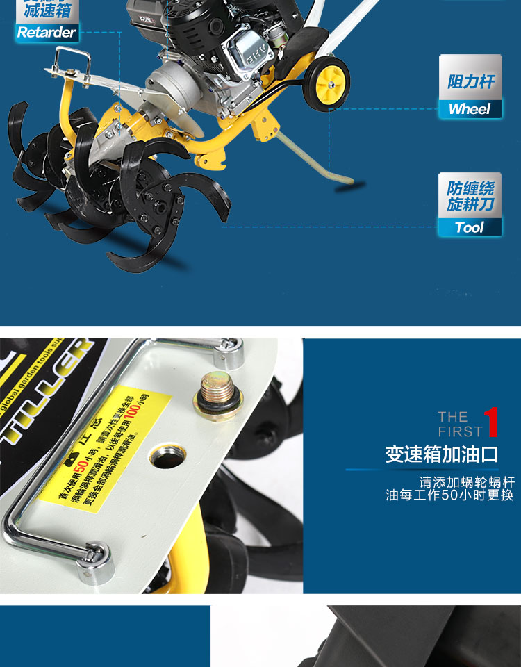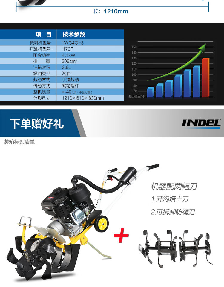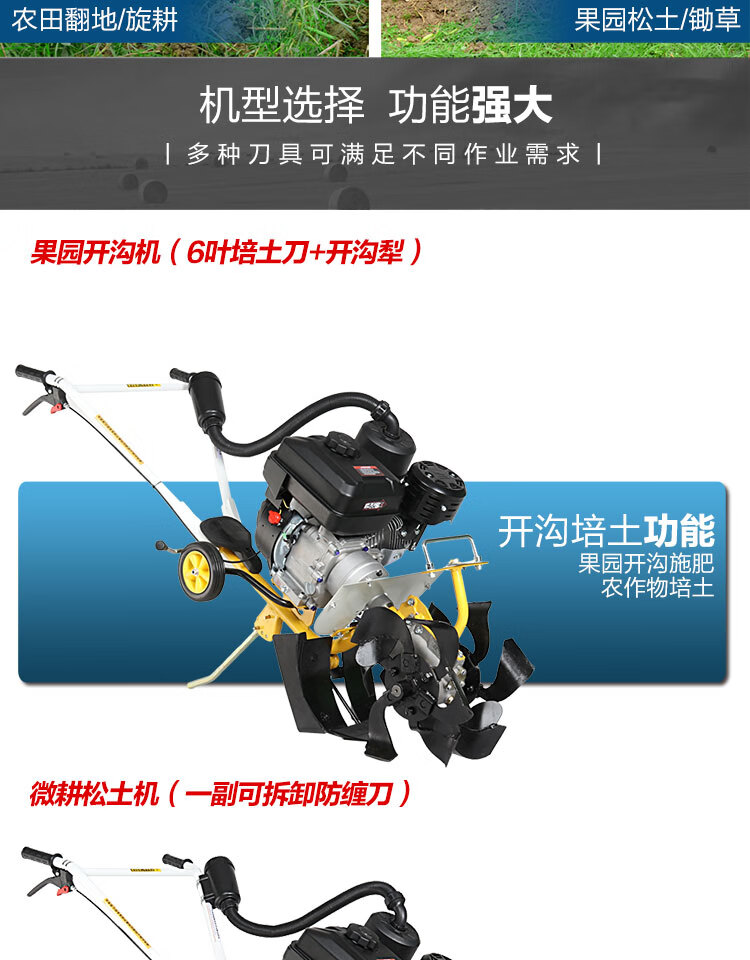 传动类型:直传动;动力类型:汽油机驱动;包装清单:微耕机主机1台、扶手架1套、可拆式防缠刀1付、6叶培土刀1付、开沟犁1付、阻力杆1根、加长空滤器1套、工具1套、使用说明书及三包凭证1本。;