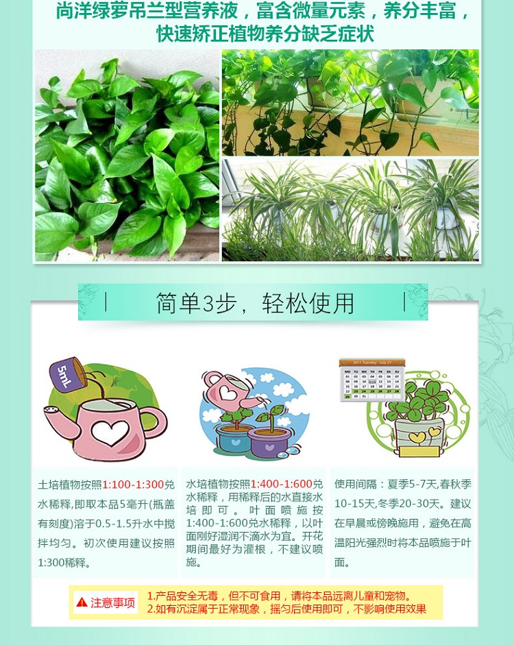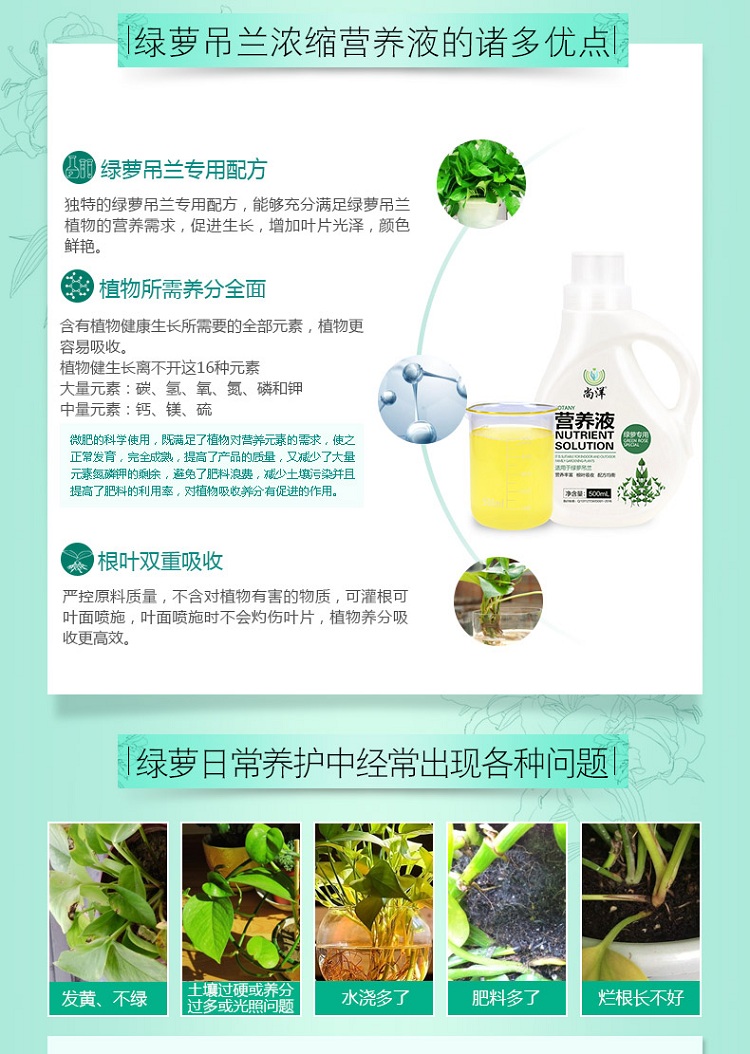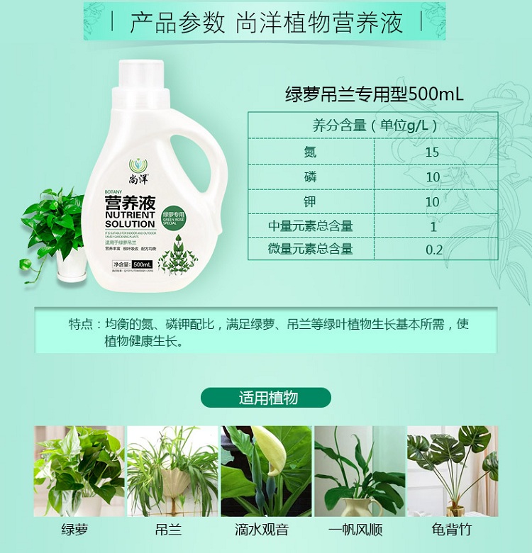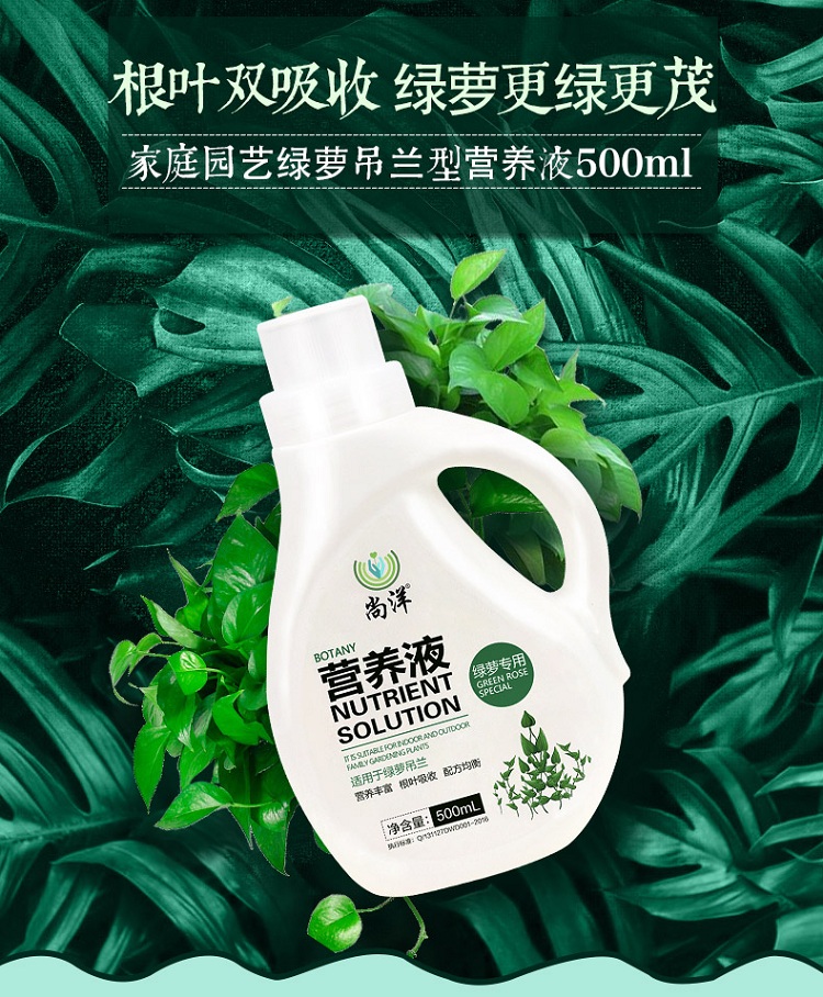 性状:液体;营养类型:营养液;适用对象:观叶植物,盆景,通用型;品牌:尚洋;包装清单:绿萝营养液*1瓶;