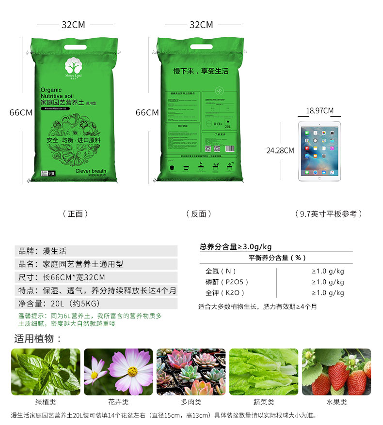 类型:椰糠;品牌:漫生活;包装清单:通用型营养土20L/袋;