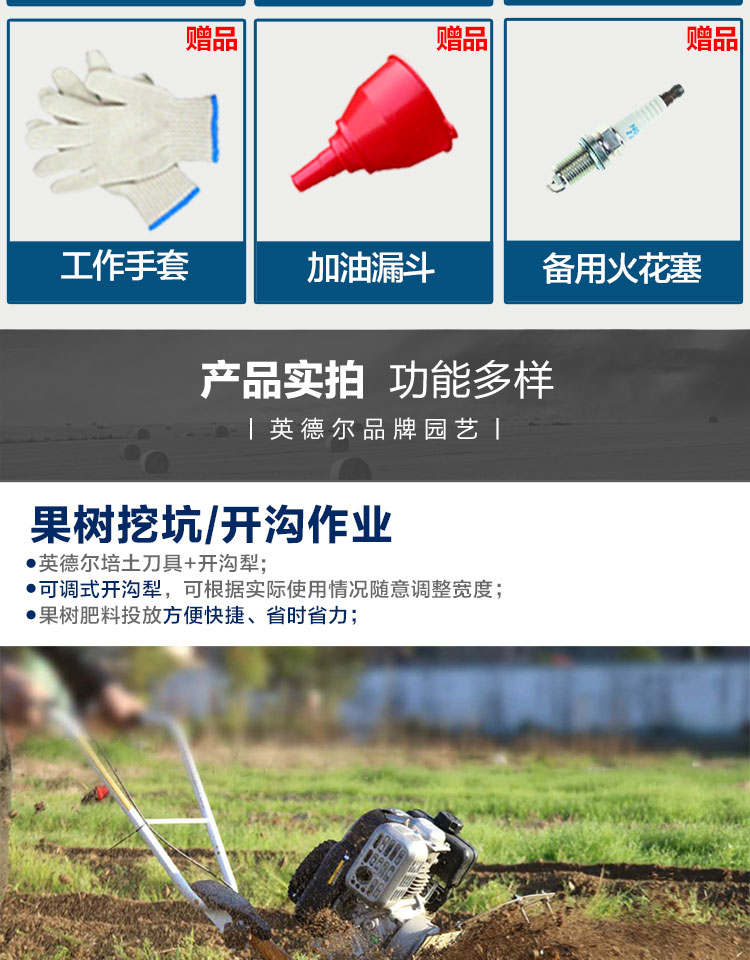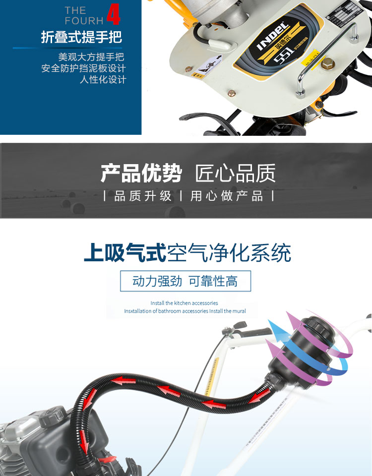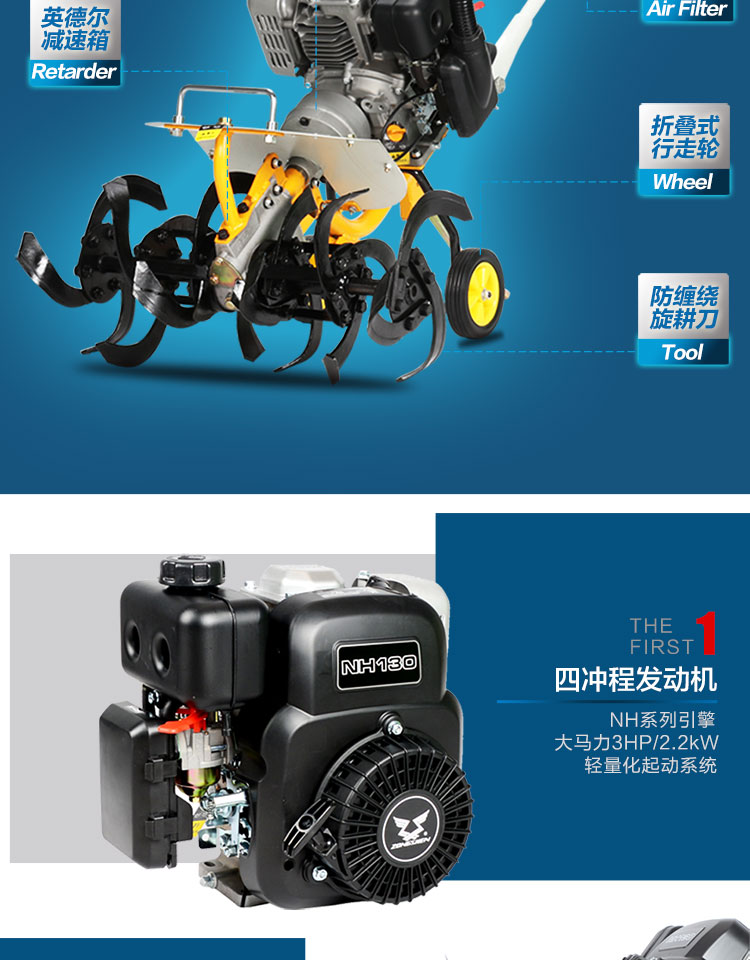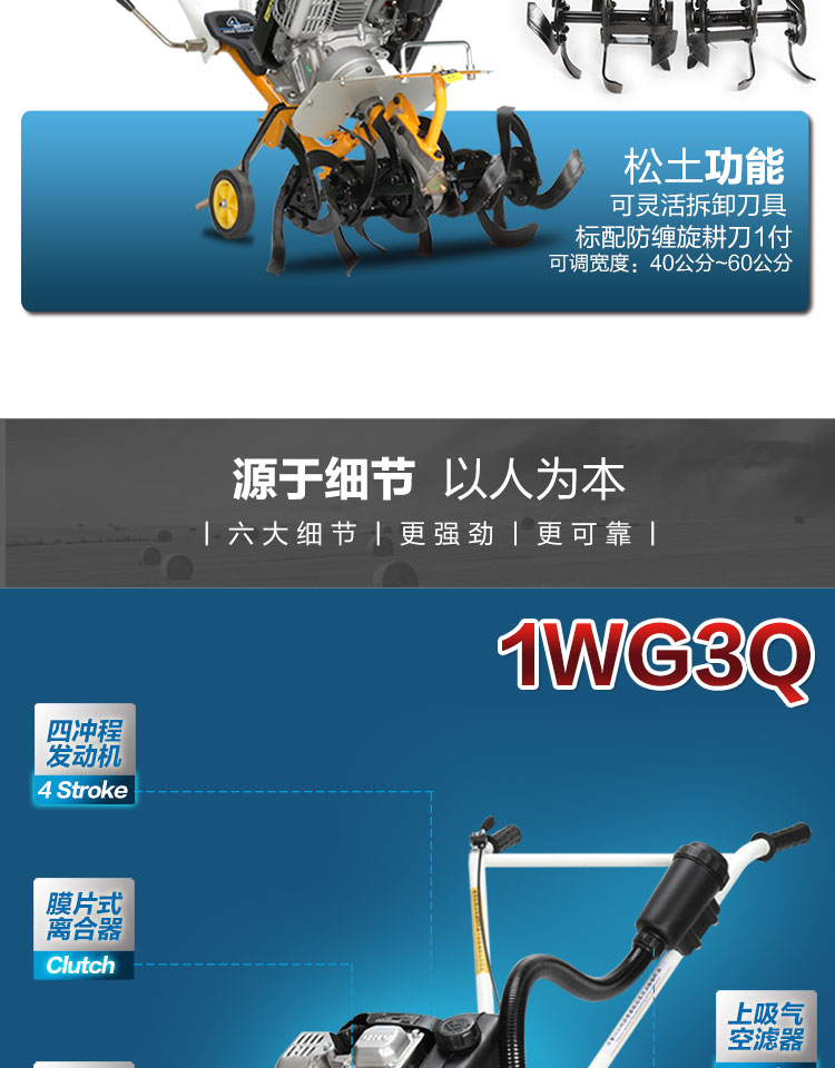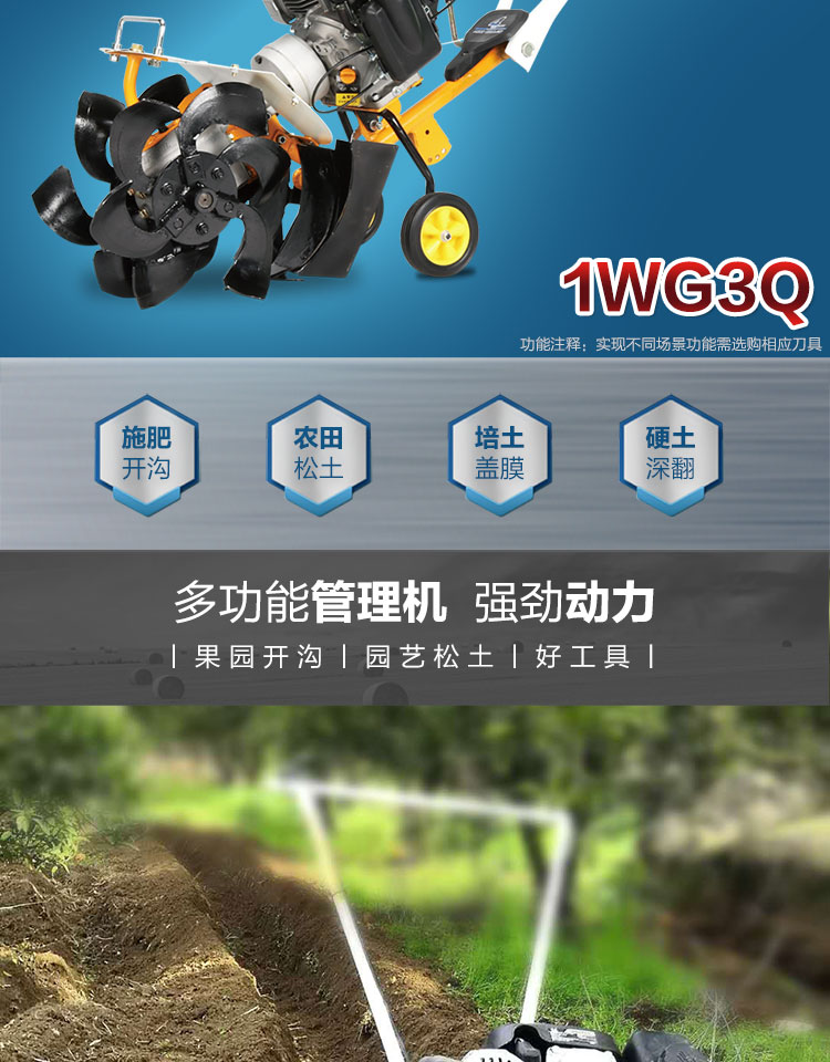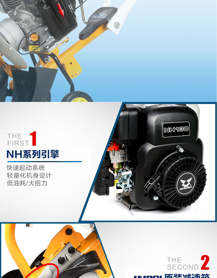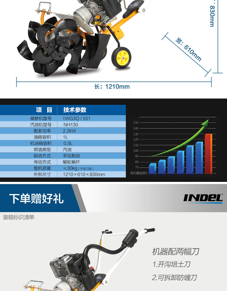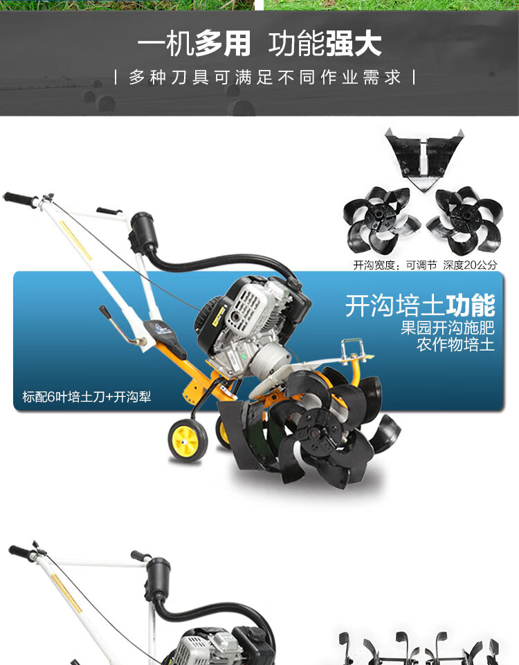 传动类型:直传动;动力类型:汽油机驱动;包装清单:微耕机主机1台、扶手架1套、可拆式防缠刀1付、6叶培土刀1付、开沟犁1付、阻力杆1根、加长空滤器1套、工具1套、使用说明书及三包凭证1本。;