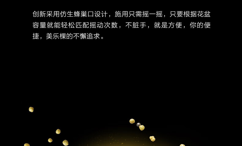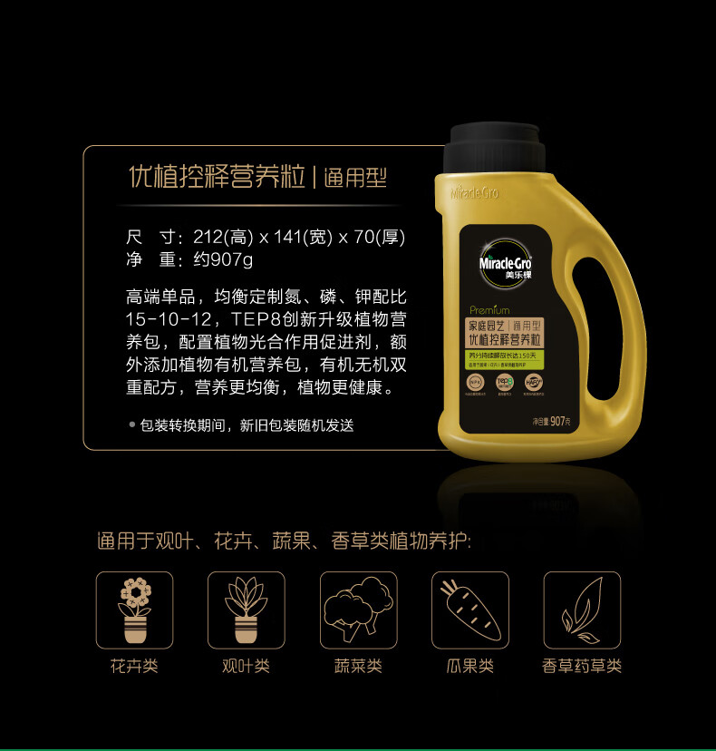 性状:固体;营养类型:控释肥;适用对象:观叶植物,观花植物,蔬菜水果,盆景,多肉植物,兰科植物,通用型;品牌:美乐棵;包装清单:商品X1;