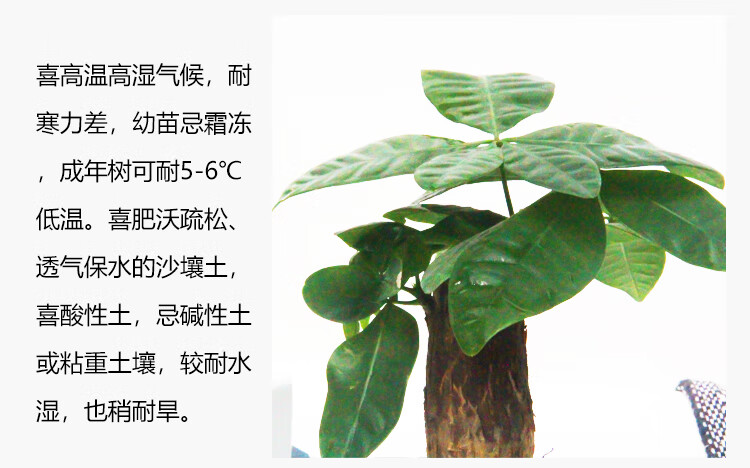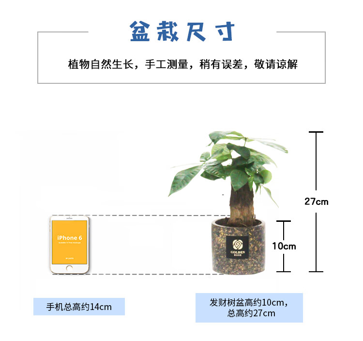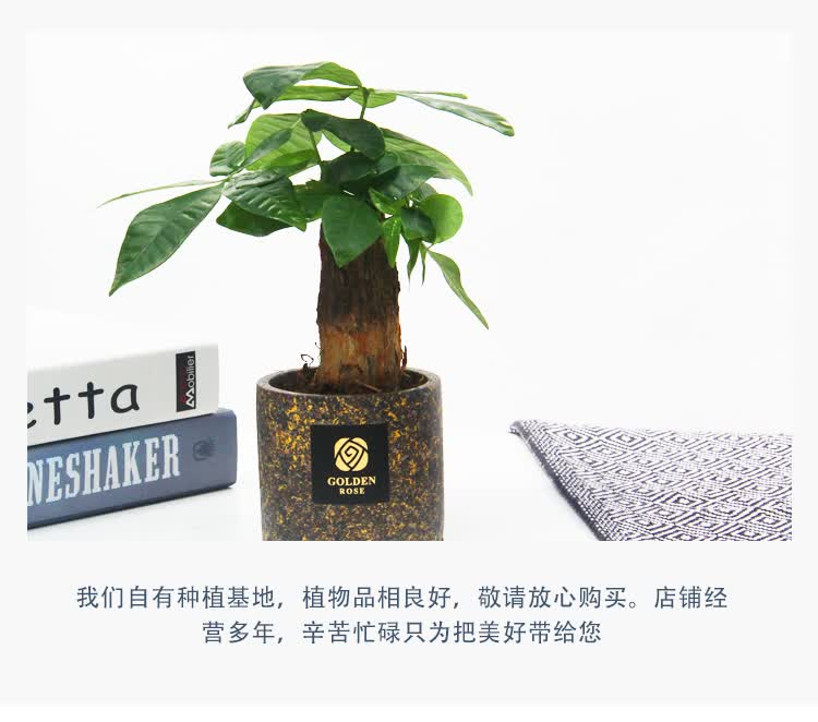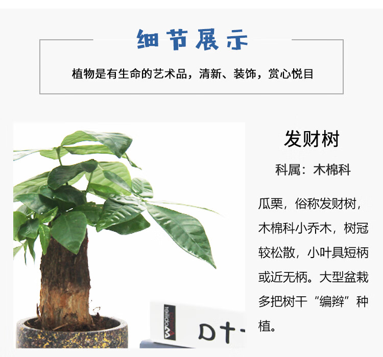 植物品种:发财树;是否含花盆:含盆;植物类别:观叶植物;适用空间:阳台,客厅,办公桌,书房;包装清单:发财树x1,花盆x1;