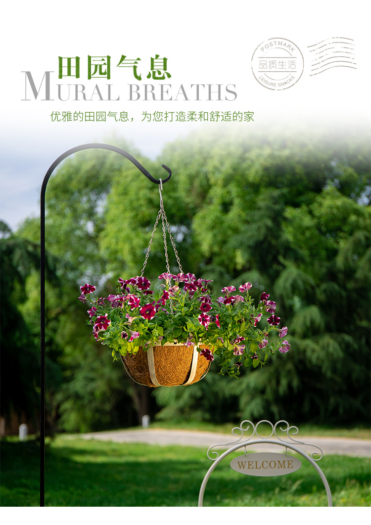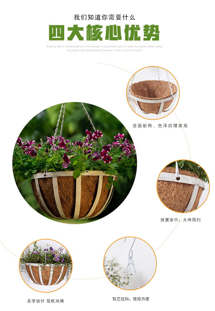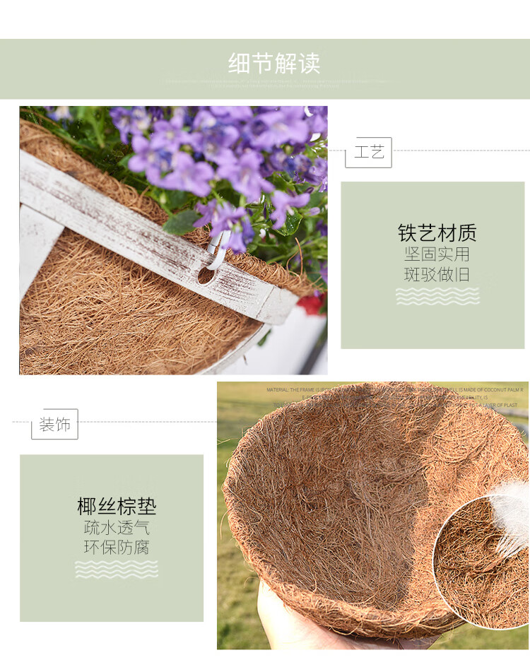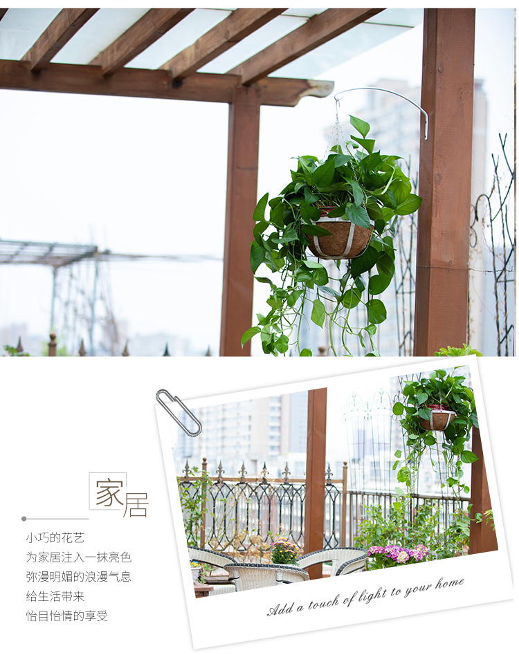 风格:田园;附加功能:悬挂;尺寸:21-25cm;材质:金属;适用空间:垂吊;底部留孔:有孔;品牌:叶哇;包装清单:椰棕垫*2、铁链*2、挂钩*2、金属花篮*2;