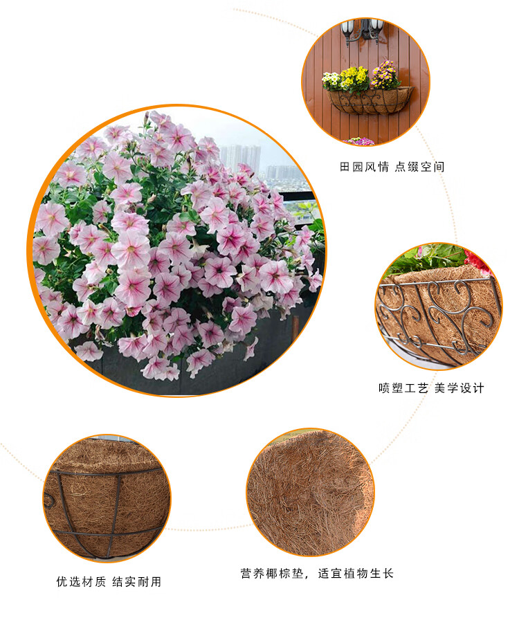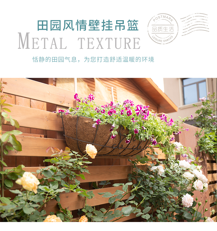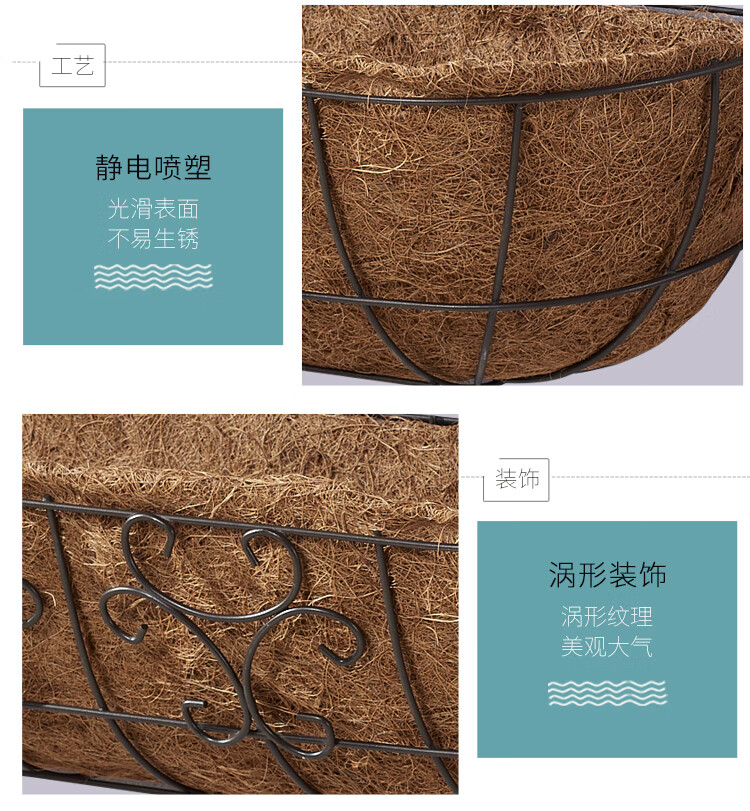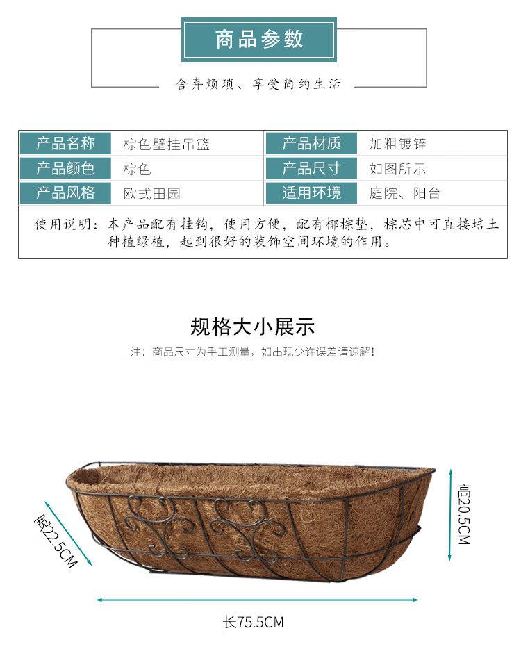 风格:田园;附加功能:悬挂;尺寸:31cm以上;材质:金属;适用空间:壁挂;底部留孔:有孔;品牌:叶哇;包装清单:椰棕垫*1、挂钩*1、金属花篮*1;